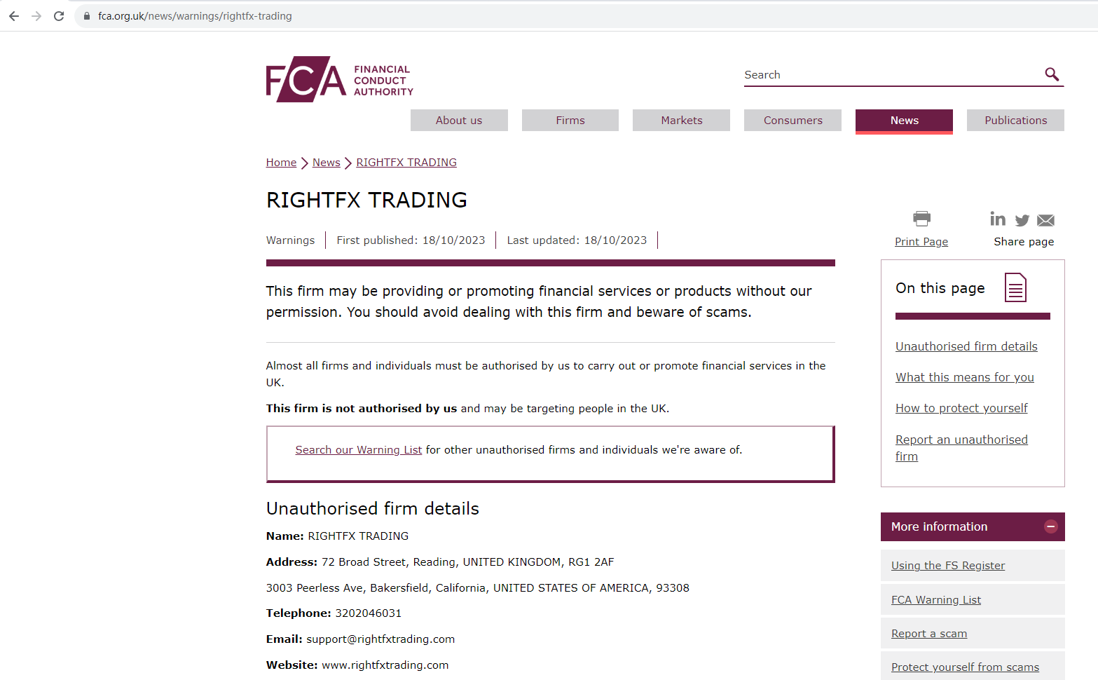 On 18 October 2023, the United Kingdom Financial Conduct Authority (UK FCA) issued a warning that RIGHTFX TRADING was providing financial services or products in the UK without authorisation. You may visit: https://www.fca.org.uk/news/warnings/rightfx-trading