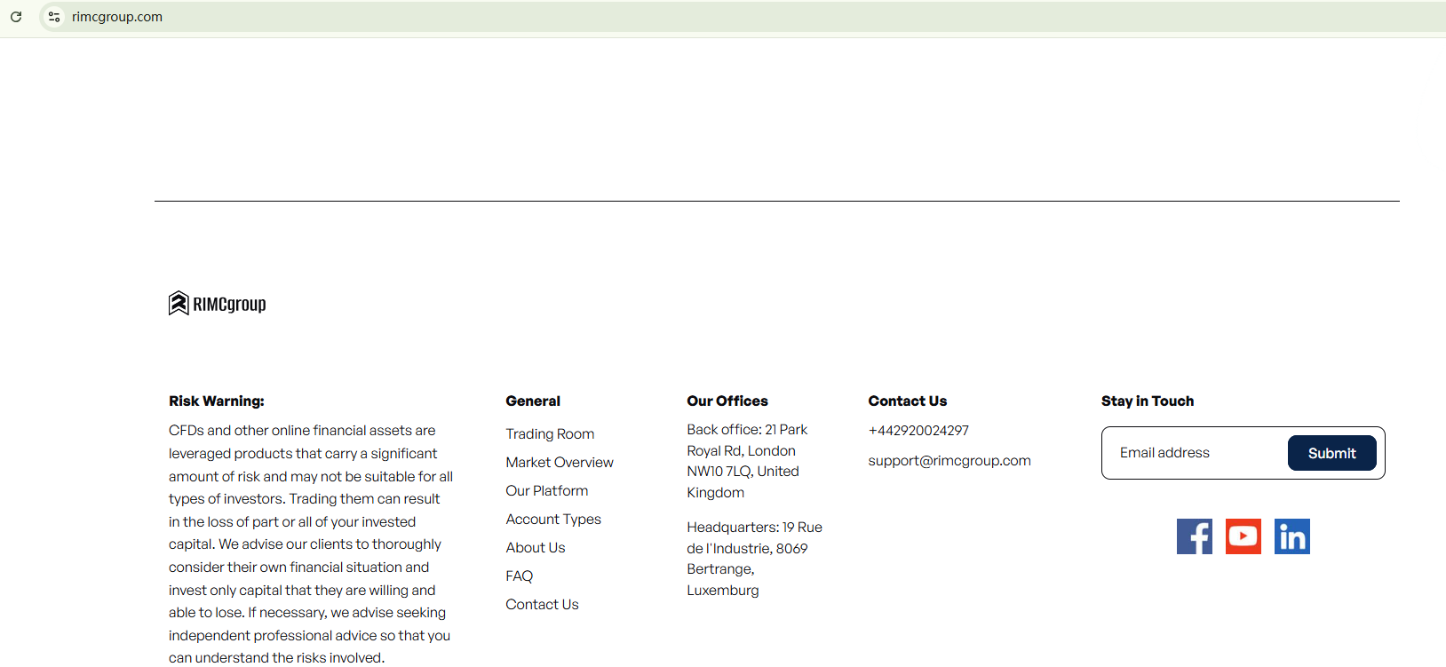 RIMCgroup fails to provide any useful information to substantiate its authenticity and legitimacy. This lack of transparency indicates significant risks and a potential scam. In addition, the Belgian Financial Services and Markets Authority (FSMA) has blacklisted RIMCgroup, advising against responding to offers made by this trading platform.