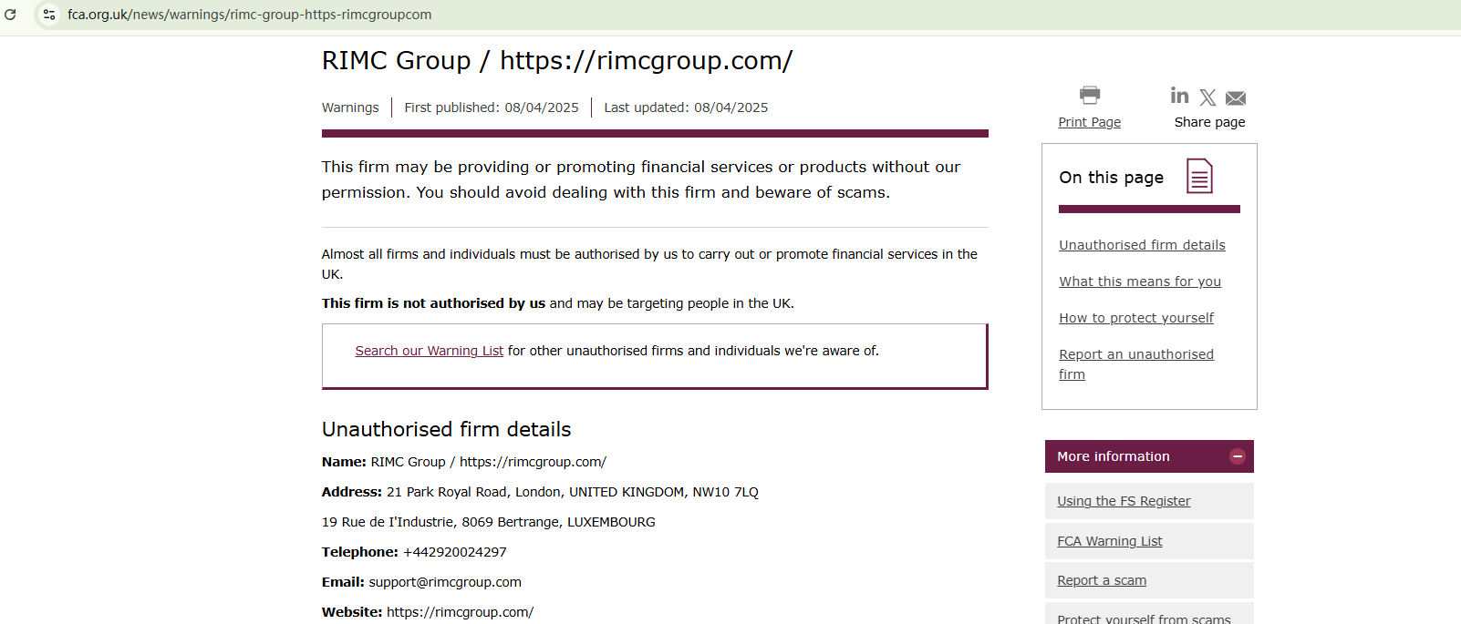 On April 8, 2025, the Financial Conduct Authority (FCA) issued a warning against RIMCgroup, believing this company might be providing financial services or products without proper authorization in the UK. https://www.fca.org.uk/news/warnings/rimc-group-https-rimcgroupcom