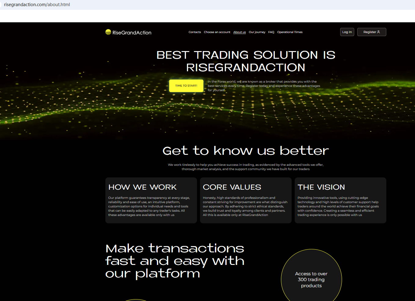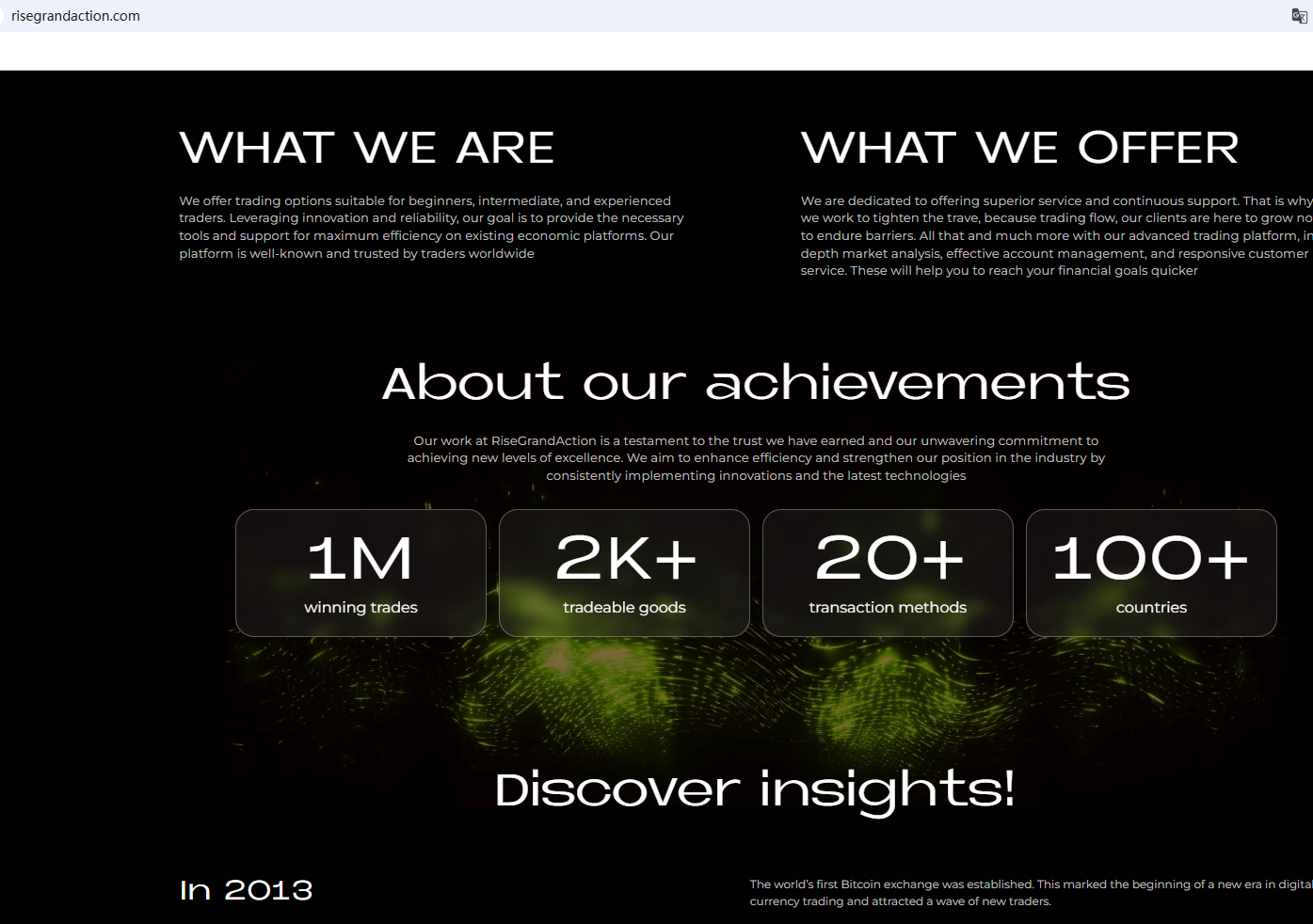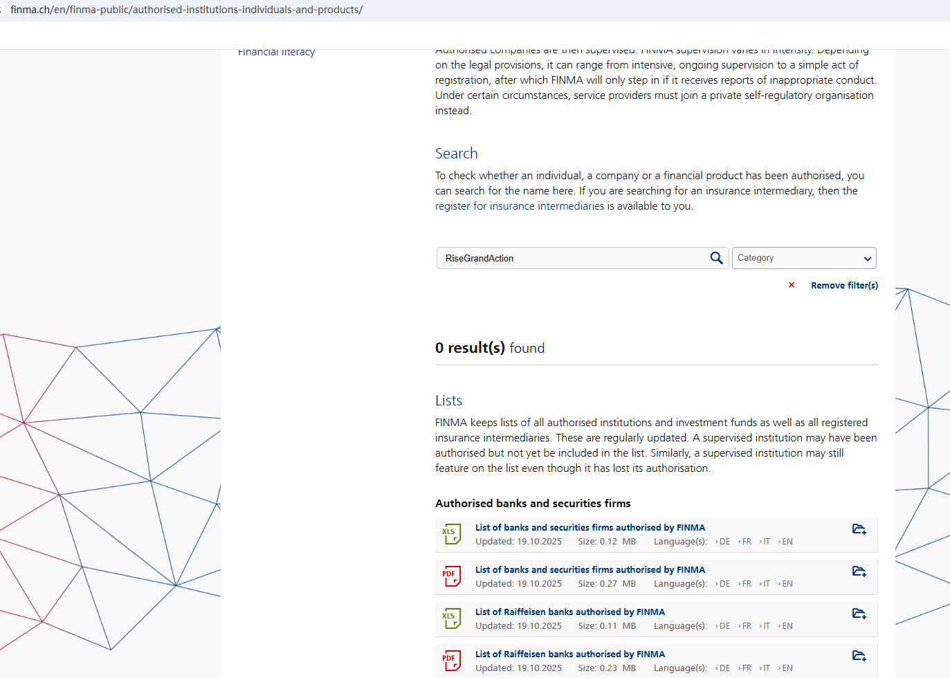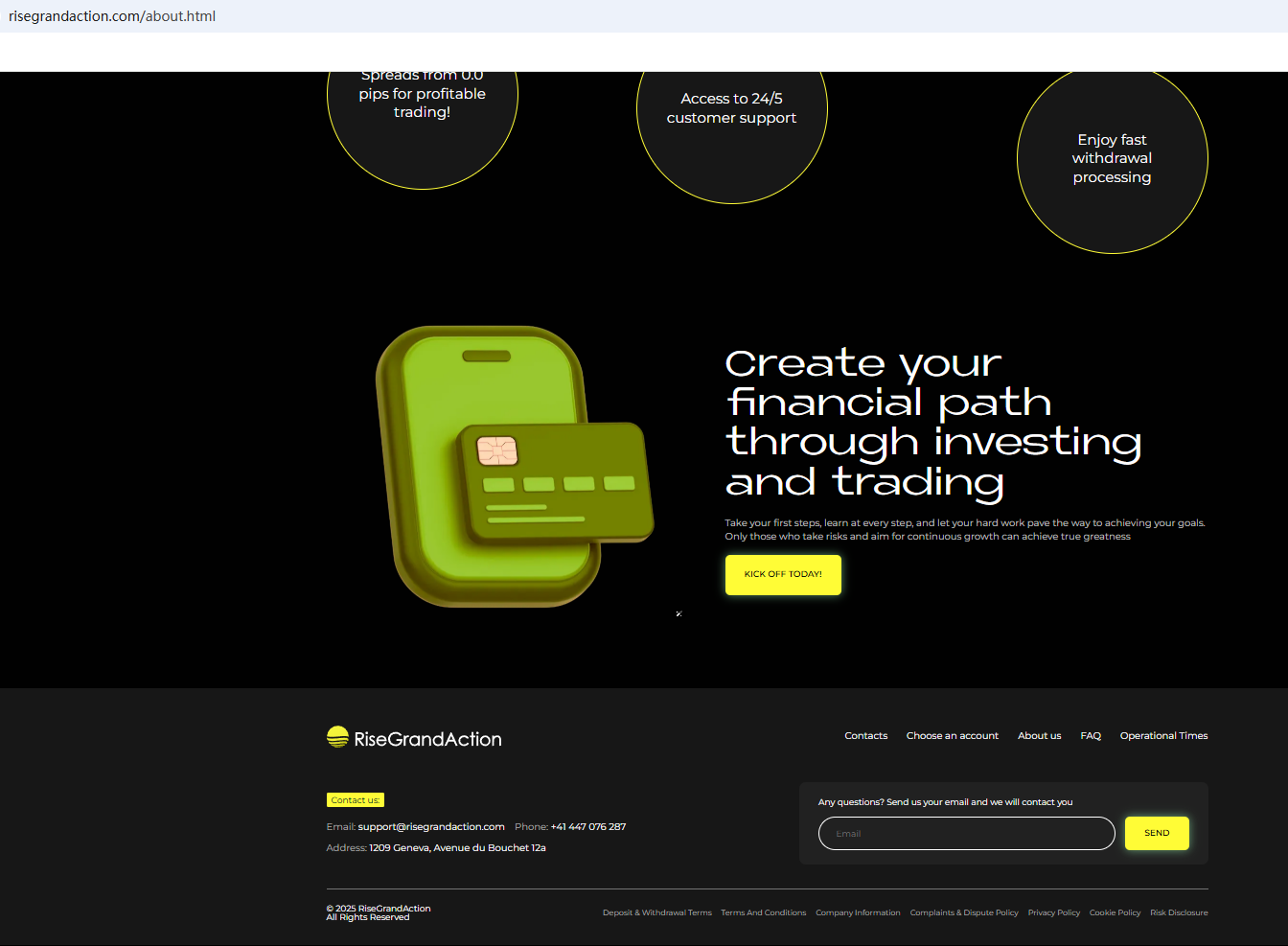 According to its website, its office is located in Geneva. A search did not find any matching information with the Swiss Financial Market Supervisory Authority (FINMA). In addition, the Financial Services and Markets Authority (FSMA) issued a warning about RiseGrandAction for the lack of the required authorization.