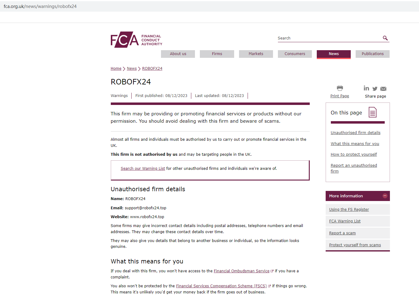 On 8 December 2023, the United Kingdom Financial Conduct Authority (UK FCA) issued a warning that ROBOFX24 was providing financial services or products in the UK without authorisation. You may visit: https://www.fca.org.uk/news/warnings/robofx24