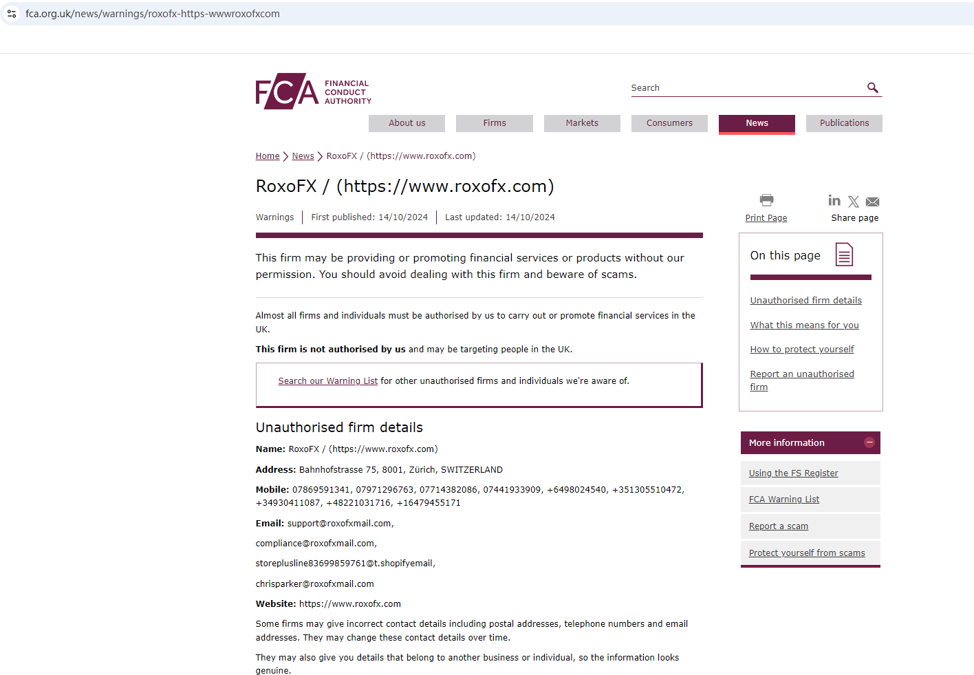 On October 14, 2024, the Financial Conduct Authority (FCA) issued a warning against RoxoFX, believing this company might be providing financial services or products without proper authorization in the UK. https://www.fca.org.uk/news/warnings/roxofx-https-wwwroxofxcom