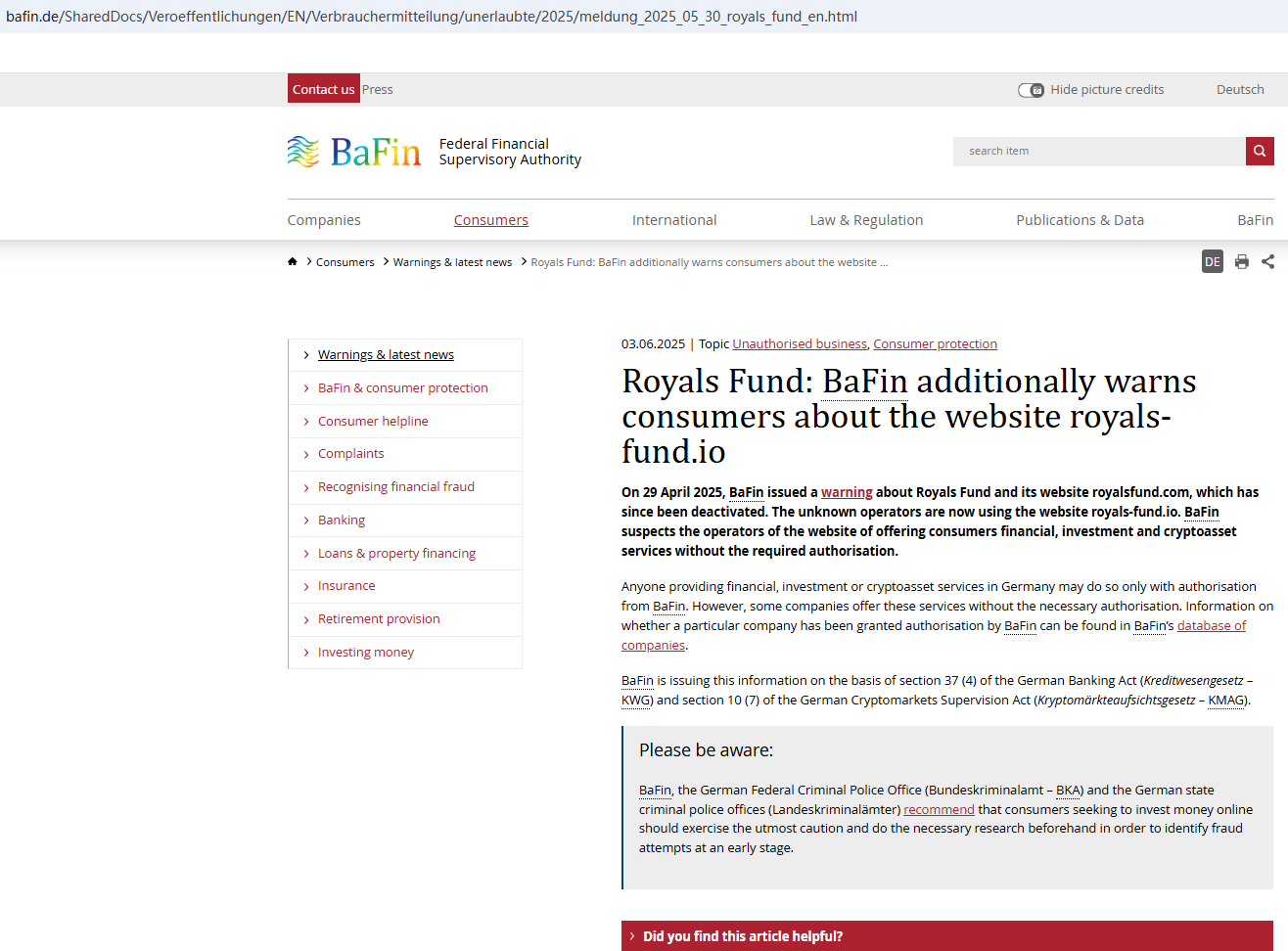 On June 3, 2025, the Federal Financial Supervisory Authority (BaFin) issued a warning against Royals Fund for the lack of the required authorization. https://www.bafin.de/SharedDocs/Veroeffentlichungen/EN/Verbrauchermitteilung/unerlaubte/2025/meldung_2025_05_30_royals_fund_en.html