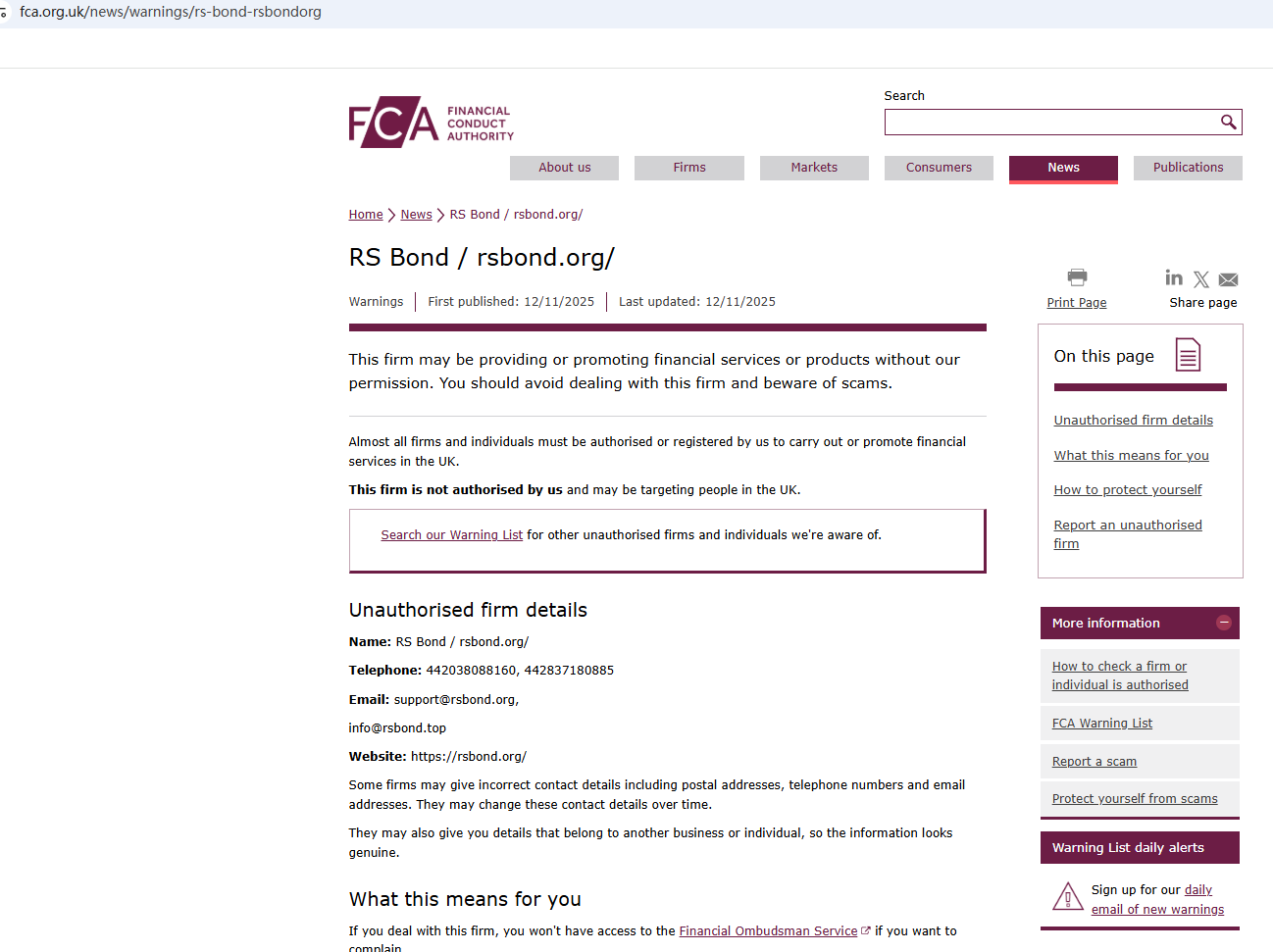 On Nov 12, 2025, the Financial Conduct Authority (FCA) issued a warning regarding RSBond, suspecting that this company may be offering financial services or products without the necessary authorization. https://www.fca.org.uk/news/warnings/rs-bond-rsbondorg