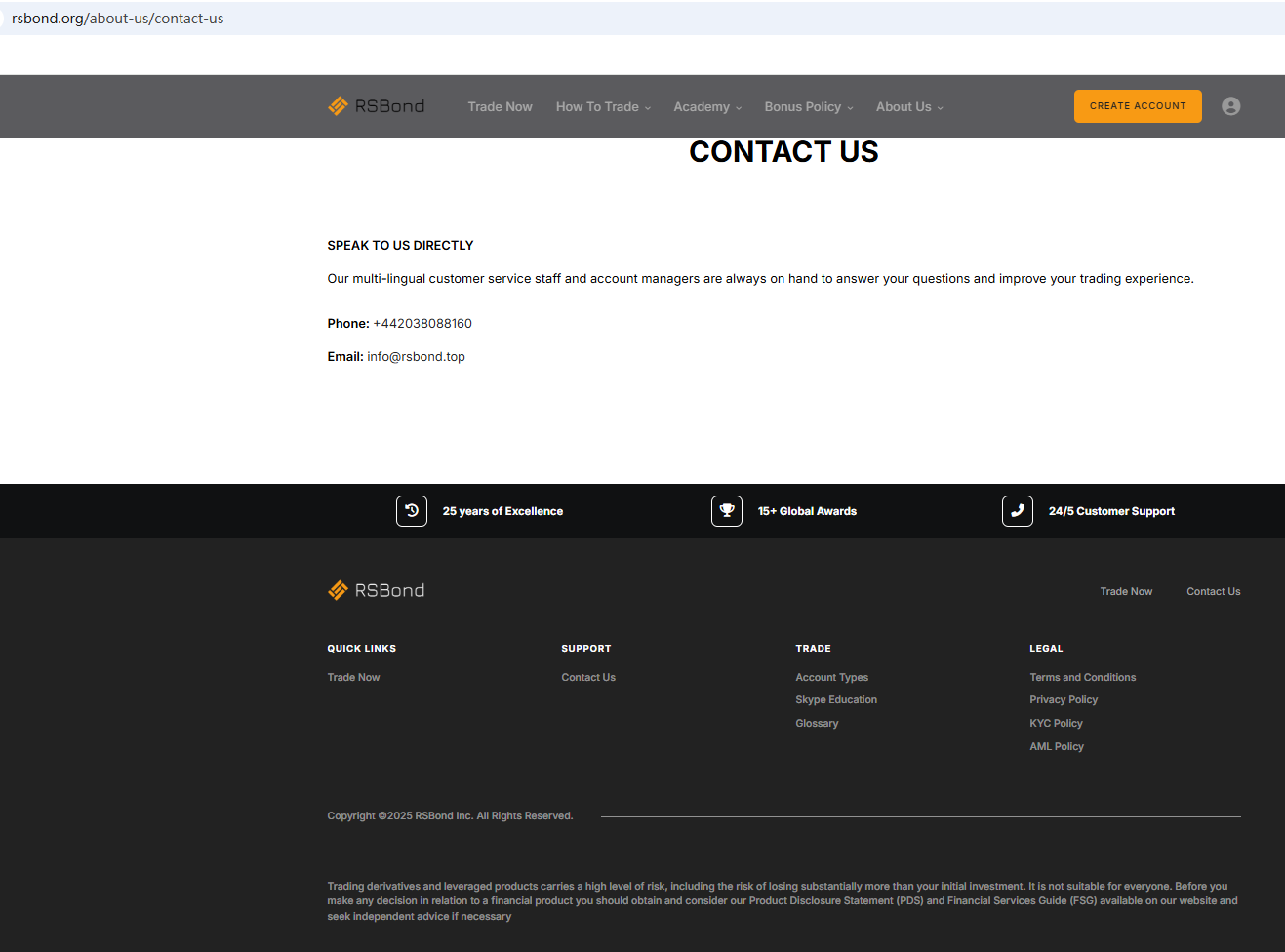 It claims to be a reliable company, but fails to display any valid regulatory information on its website for verification, which is highly untrustworthy. In addition, the Financial Conduct Authority (FCA) issued a warning regarding RSBond, suspecting that this company may be offering financial services or products without the necessary authorization.