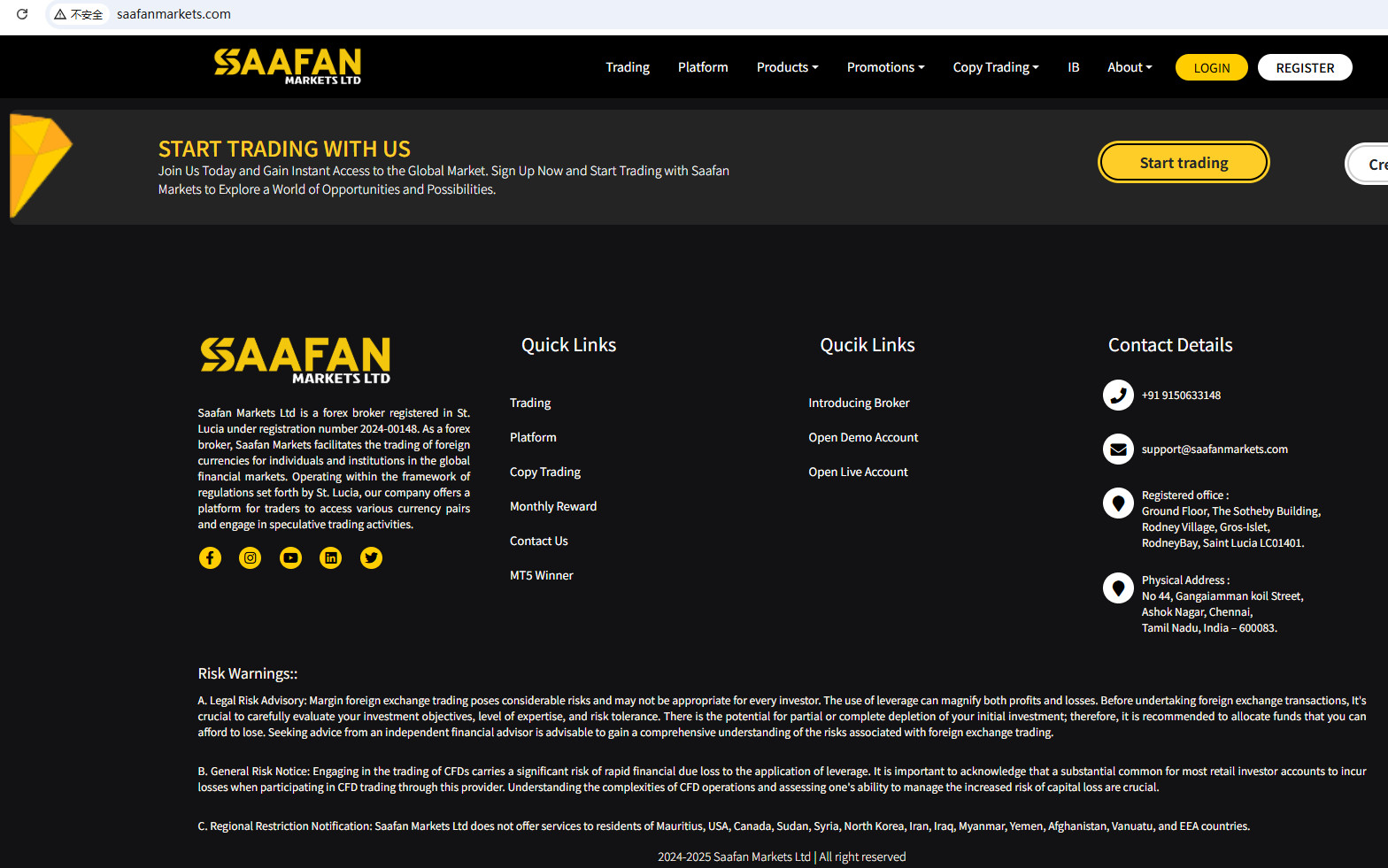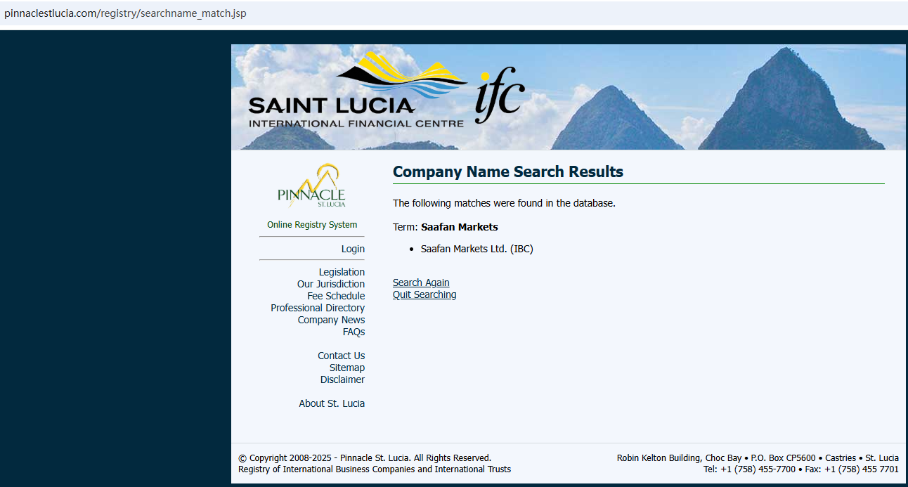 Upon investigation, we found that Saafan Markets Ltd is registered with the International Financial Centre (IFC) in Saint Lucia, an International Business Companies Registry that doesn't license forex trading brokerage activities.
