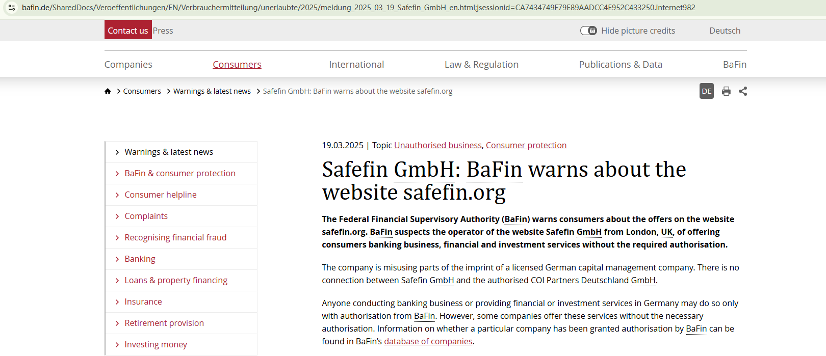 On March 19, 2025, the Federal Financial Supervisory Authority (BaFin) issued a warning against SafeFin, noting that this is not authorized by them and it is not associated with the authorized COI Partners Deutschland GmbH. https://www.bafin.de/SharedDocs/Veroeffentlichungen/EN/Verbrauchermitteilung/unerlaubte/2025/meldung_2025_03_19_Safefin_GmbH_en.html;jsessionid=CA7434749F79E89AADCC4E952C433250.internet982