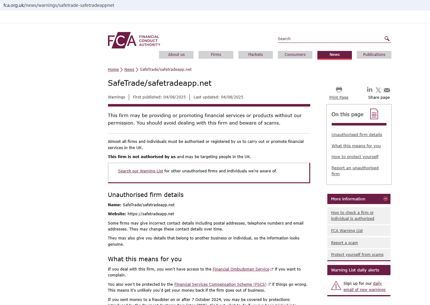 On Aug 4, 2025, the Financial Conduct Authority (FCA) issued a warning against safetradeapp.net, believing this company might be providing financial services or products without proper authorization in the UK. https://www.fca.org.uk/news/warnings/safetrade-safetradeappnet