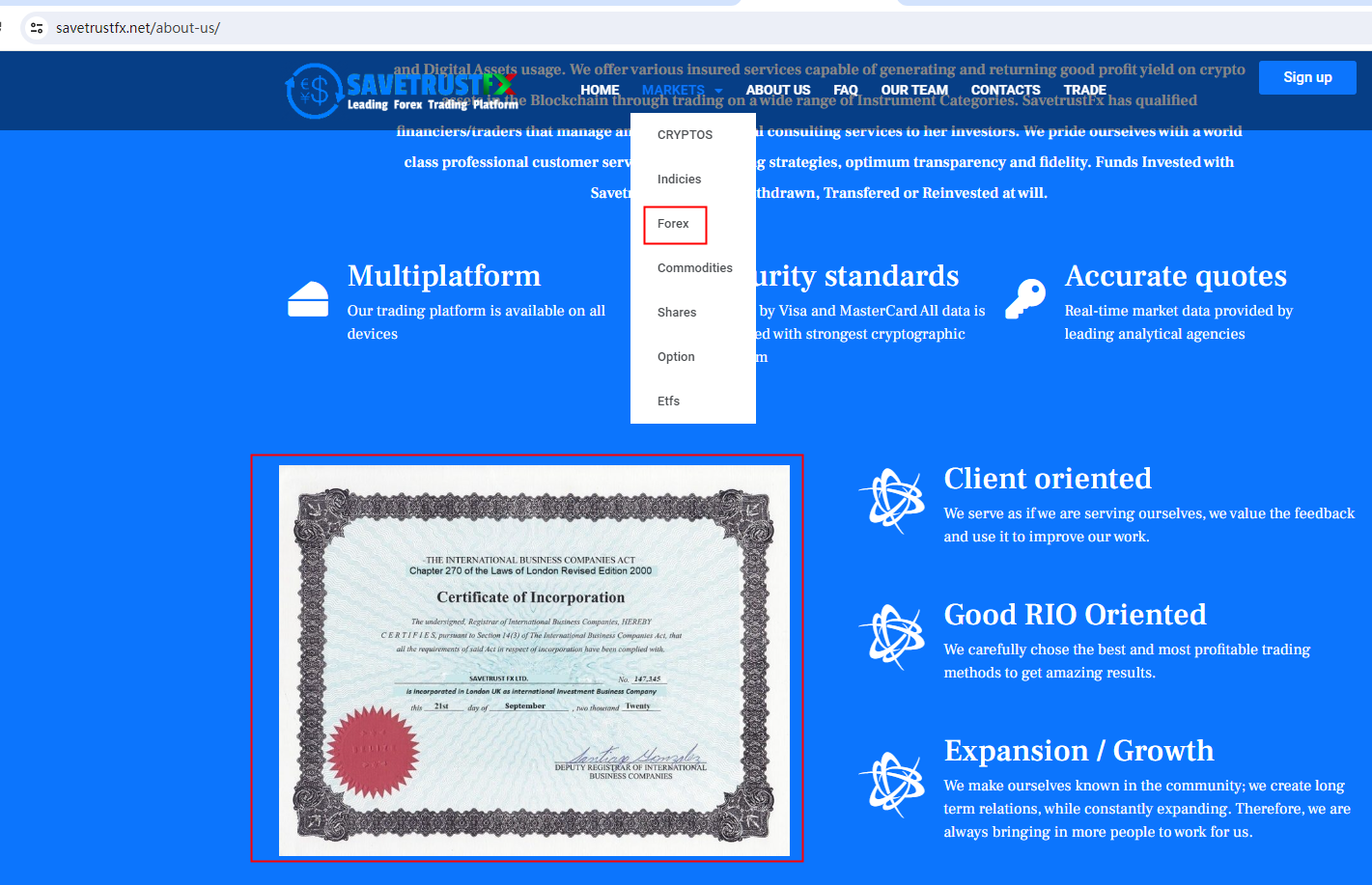 SavetrustFx claims to be incorporated in London UK.