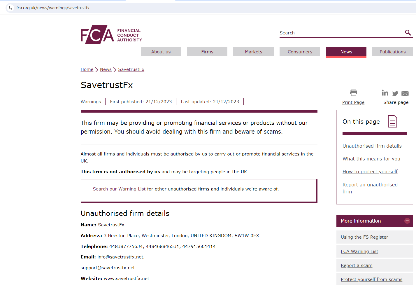 On 21 December 2023, the United Kingdom Financial Conduct Authority (UK FCA) issued a warning that SavetrustFx was providing financial services or products in the UK without authorisation. You may visit: https://www.fca.org.uk/news/warnings/savetrustfx
