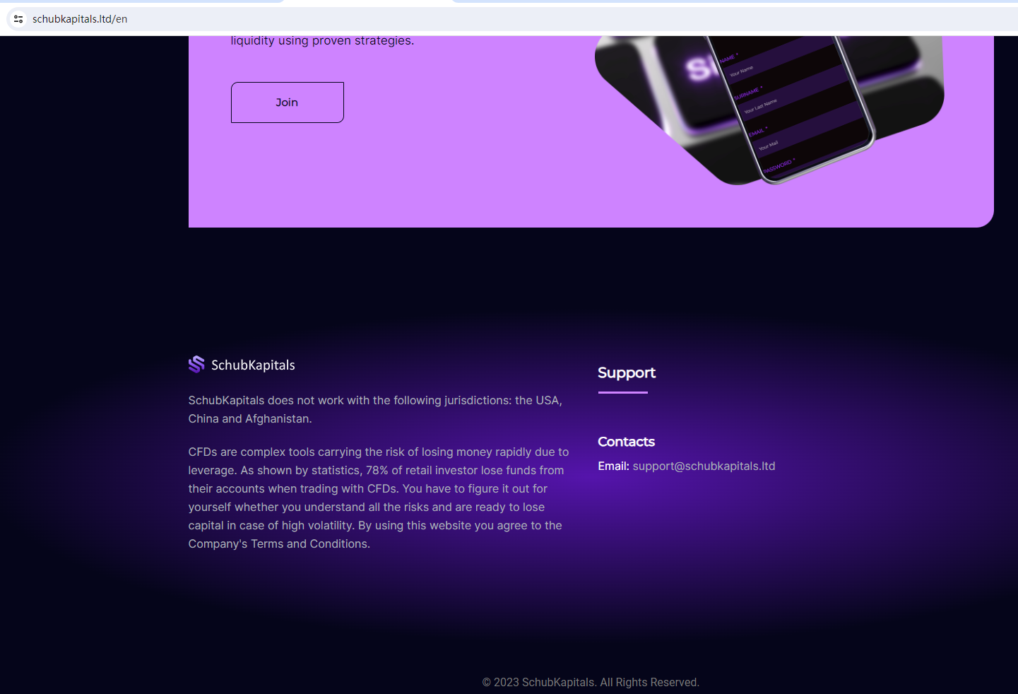 SchubKapitals claims to be a reliable company without presenting any information about its regulation or contact. The lack of such important information may be a distinct signal of an unlicensed broker, as regulated companies always present their accreditations and licenses in a prominent position. It is a red flag.