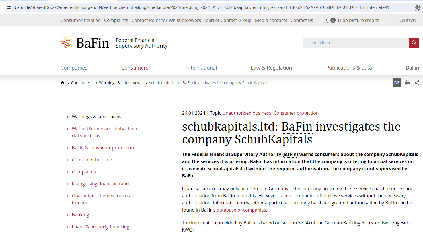On 26 January 2024, the Federal Financial Supervisory Authority (BaFin) issued a warning that SchubKapitals was providing financial services or products without authorisation. You may visit: https://www.bafin.de/SharedDocs/Veroeffentlichungen/EN/Verbrauchermitteilung/unerlaubte/2024/meldung_2024_01_23_SchubKapitals_en.html;jsessionid=F30676E52A7A61068DB02001CDE7EE3F.internet991