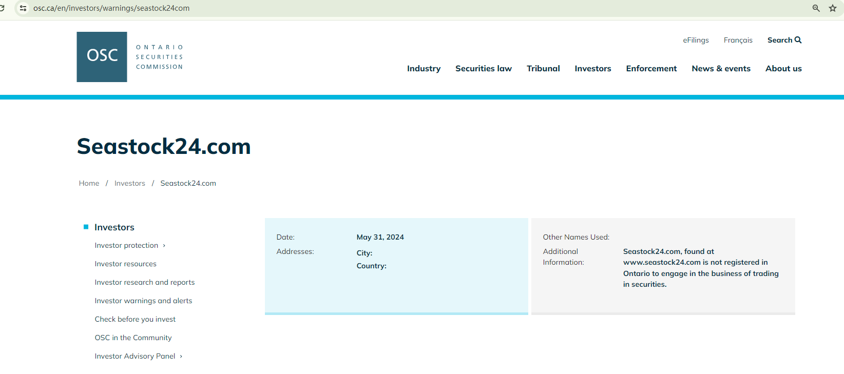 On May 31, 2024, the Ontario Securities Commission (OSC) issued a warning against Seastock24, stating that this broker is not registered in Ontario to engage in the business of trading in securities. https://www.osc.ca/en/investors/warnings/seastock24com