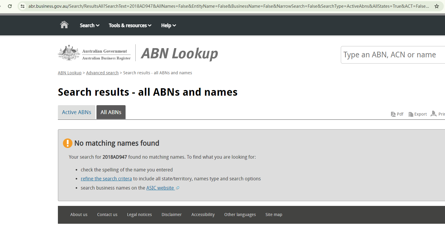 The company claims to have been regulated since 2009, but it doesn't provide any specific information to support this claim. The only piece of evidence provided is an ABN (Australian Business Number) listed at the bottom of its page, 2018AD947. However, this number does not conform to the standard ABN format. Furthermore, a search in the ABN database of the Australian Securities and Investments Commission (ASIC) yielded no results for this number.