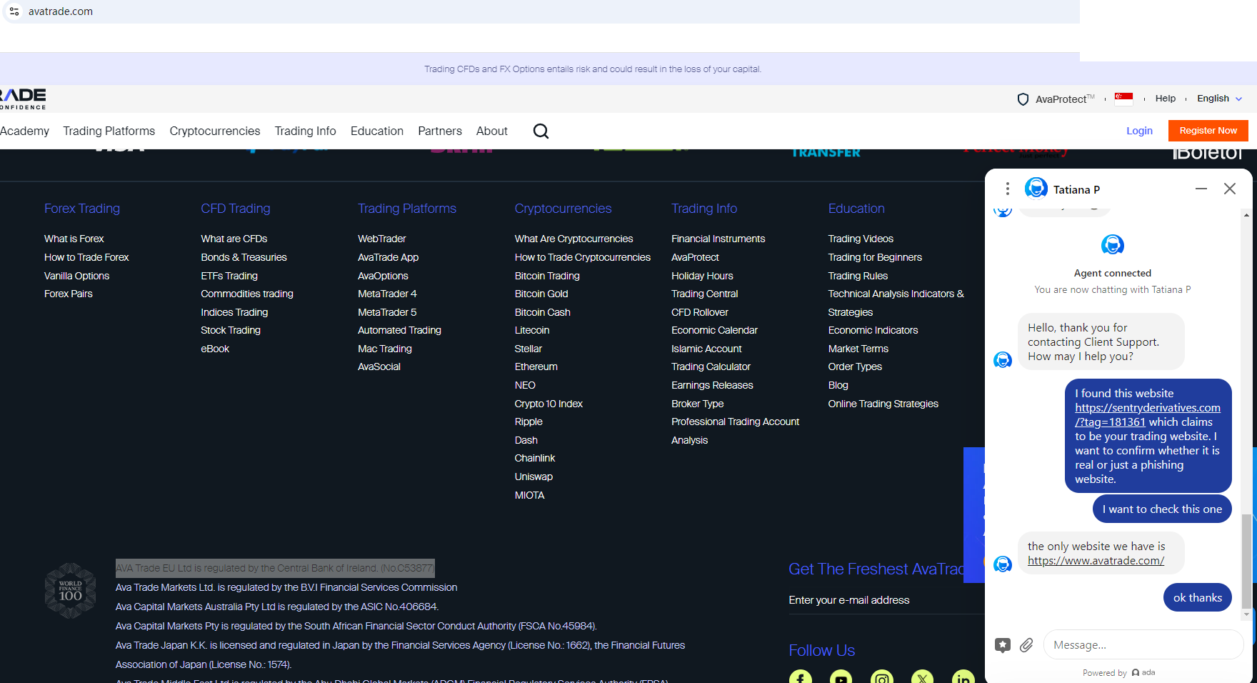 According to its website, most of the key information is missing. It says at the bottom of the website that it is the trading name of AVA Trade and is regulated by Central Bank of Ireland (CBI) and Financial Services Agency(FSA). We consulted AVA Trade's customer service, and they claimed that they did not authorize the company. The company is likely to be a phishing website. Investors are advised to identify and stay away from it.