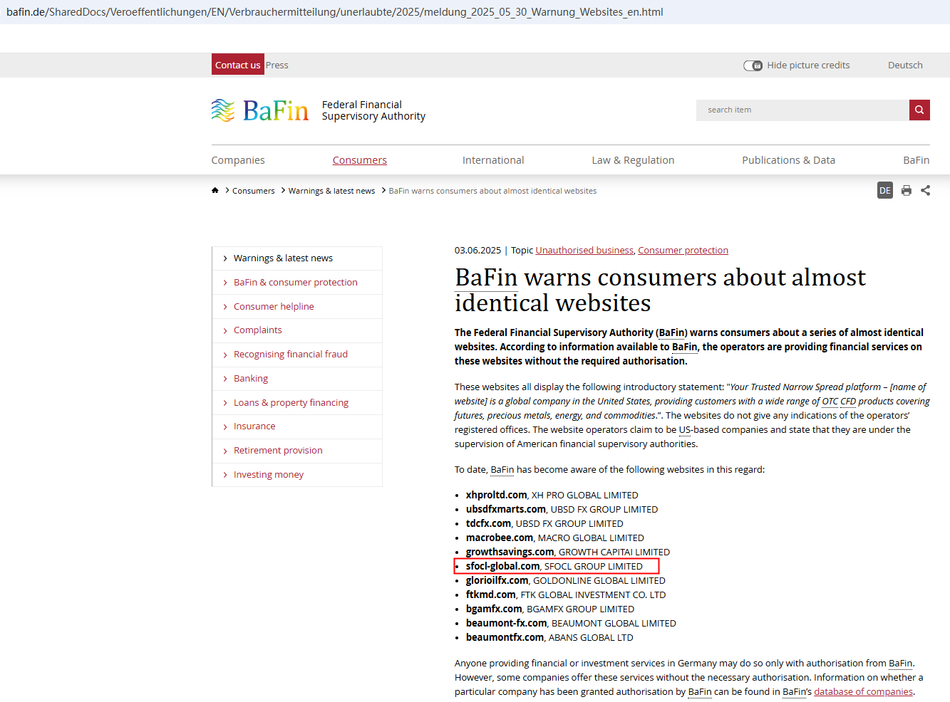 In addition, the Federal Financial Supervisory Authority (BaFin) issued a warning against SFOCL for the lack of the required authorization.