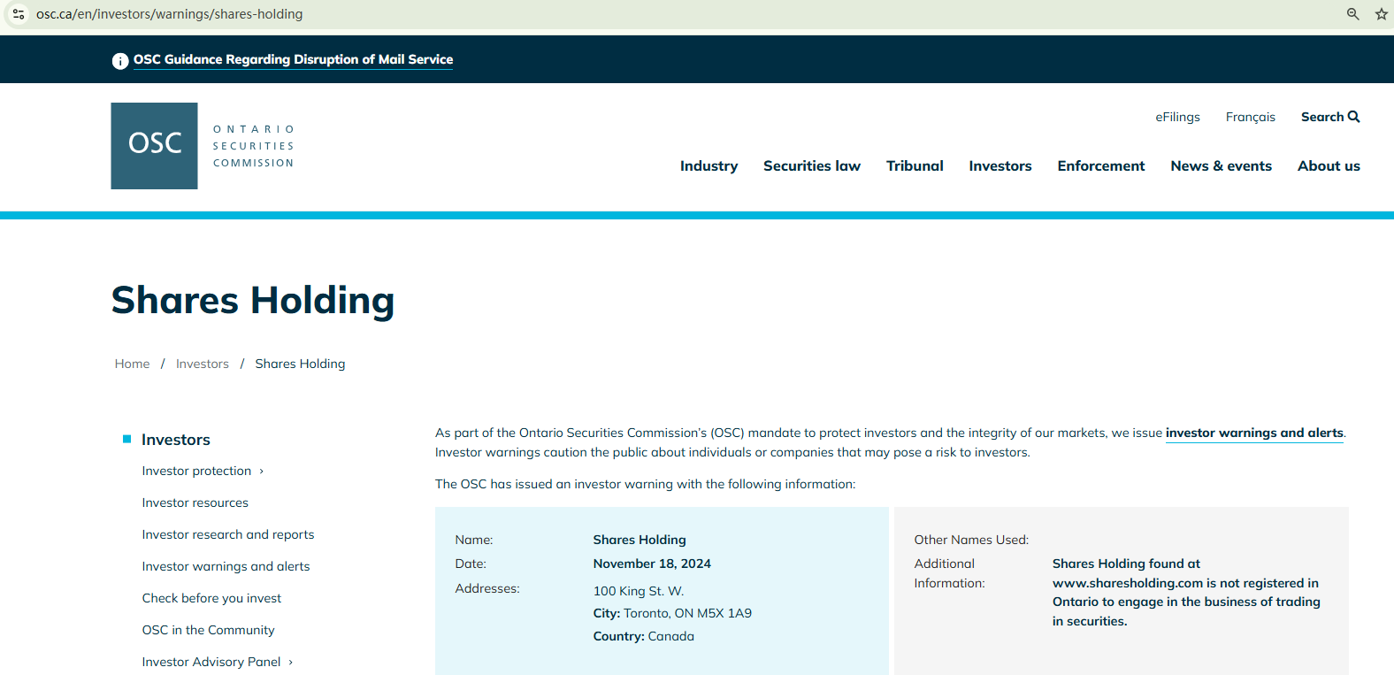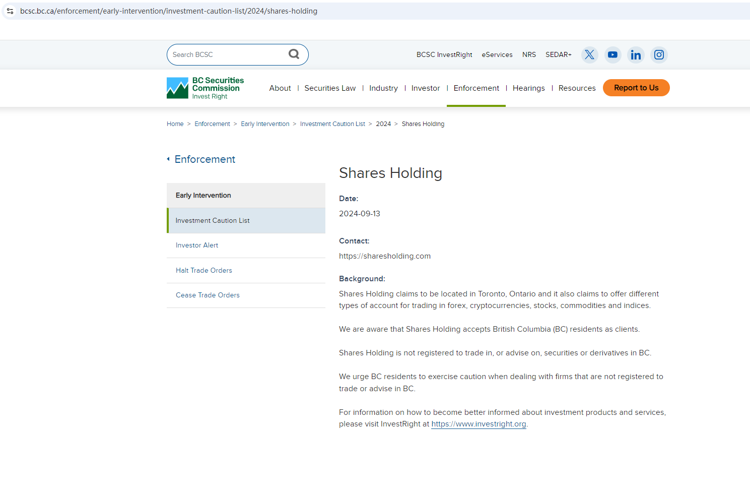 In addition, the British Columbia Securities Commission (BCSC) issued a warning against Shares Holding, identifying it as an unauthorized firm.