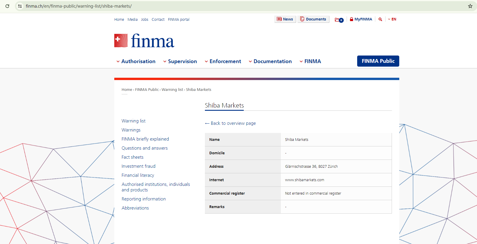 On Feb 29, 2024, the Swiss Financial Market Supervisory Authority (FINMA) issued a warning against Shiba Markets, stating that this broker is not entered in its commercial register. https://www.finma.ch/en/finma-public/warning-list/shiba-markets/