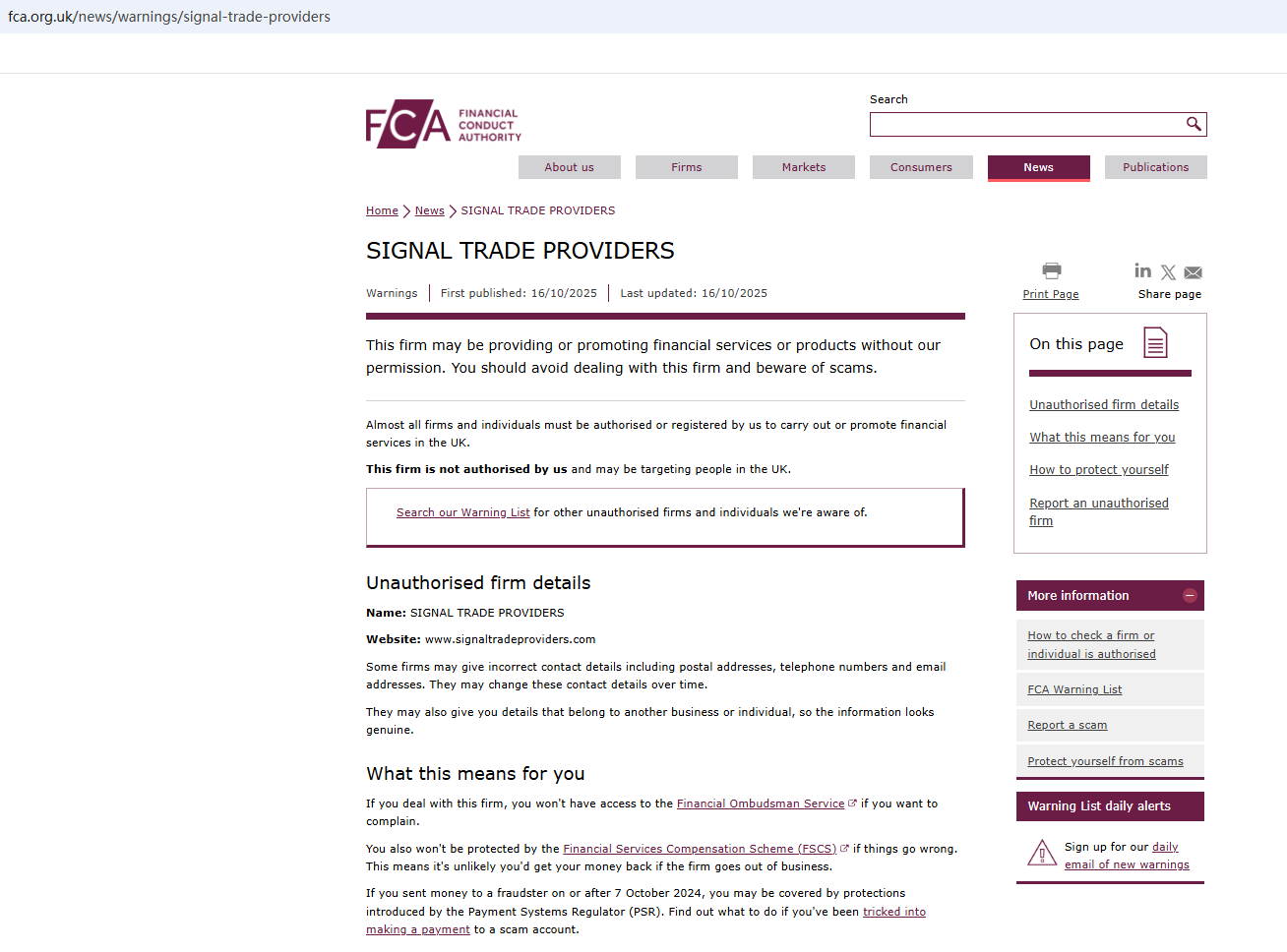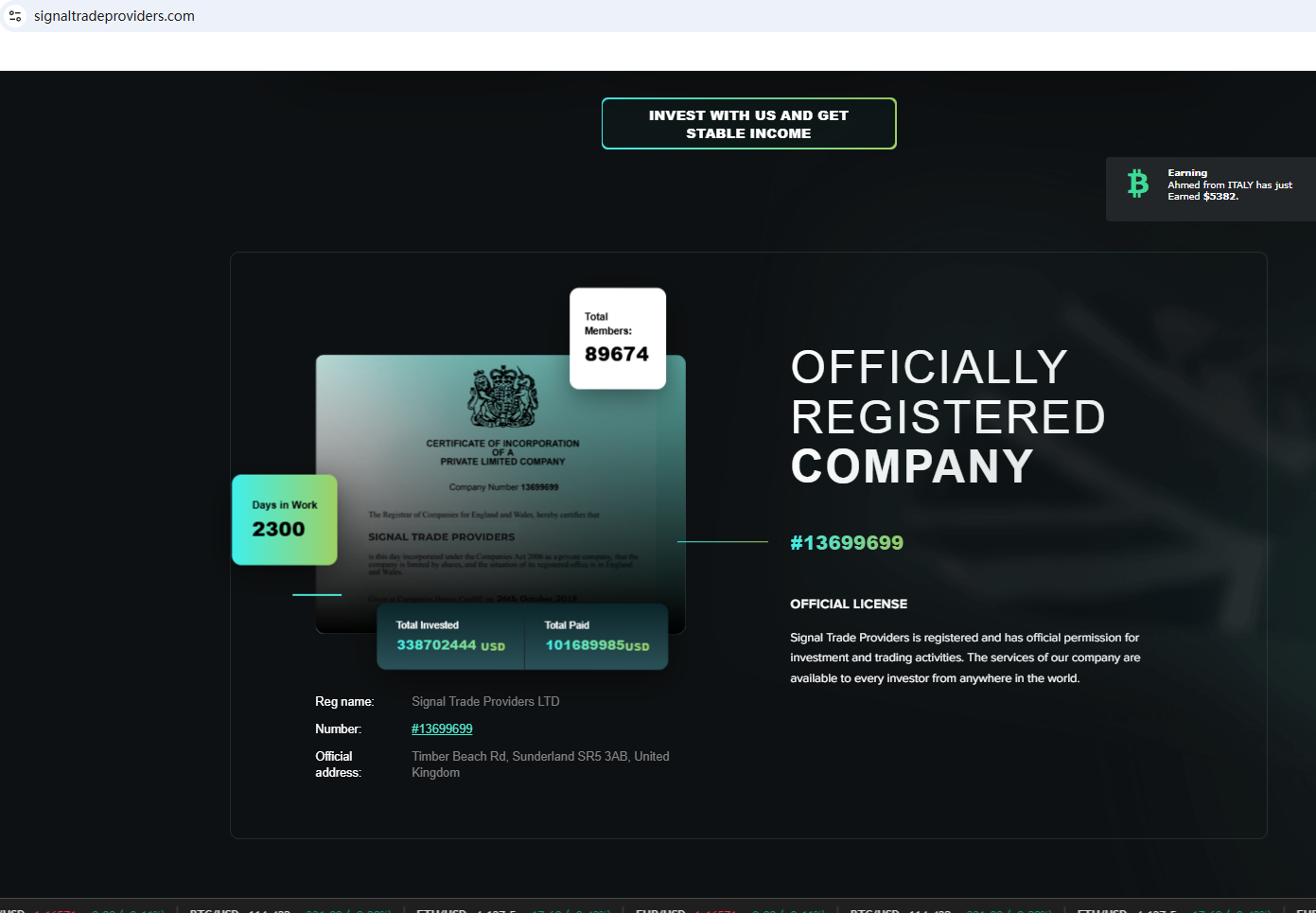 According to its website, the company claims to be reliable and provides a certificate from Companies House (CH). As we all know, CH only represents company registration and does not have the right to regulate foreign exchange. To obtain the right to exercise foreign exchange in the UK, it must be regulated by the FCA. Ironically, we found that the Financial Conduct Authority (FCA) issued a warning regarding SIGNAL TRADE PROVIDERS, suspecting that this company may be offering financial services or products without the necessary authorization.