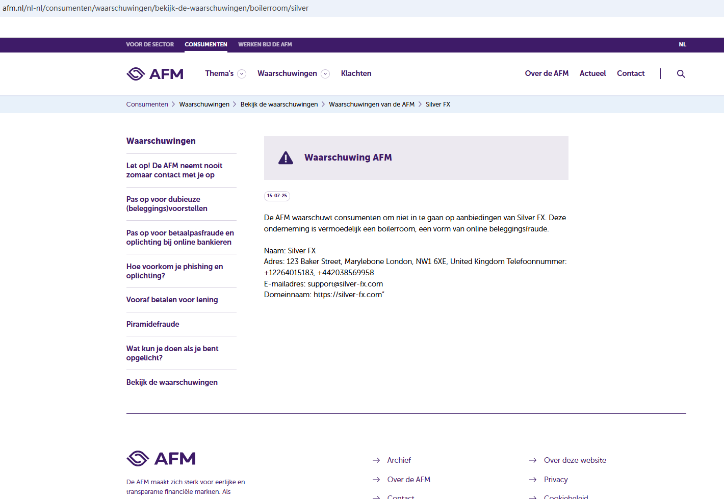 On July 15, 2025, the Netherlands Authority For the Financial Markets (AFM) issued a warning against Silver FX, believing this company might be providing financial services or products without proper authorization. https://www.afm.nl/nl-nl/consumenten/waarschuwingen/bekijk-de-waarschuwingen/boilerroom/silver
