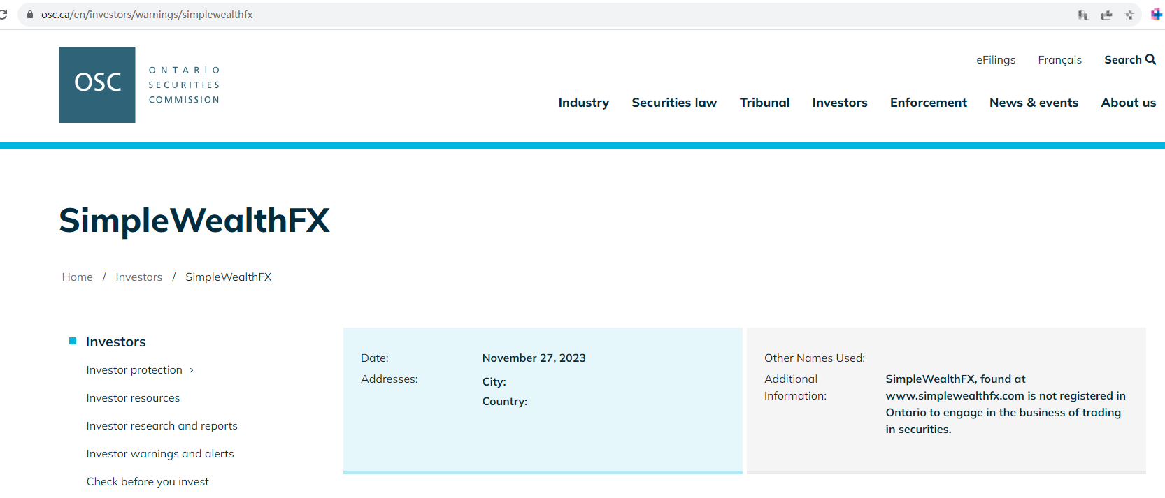 On 27 November 2023, the Ontario Securities Commission (OSC) issued a warning that SimpleWealthFX was providing financial services or products without authorisation. You may visit: https://www.osc.ca/en/investors/warnings/simplewealthfx