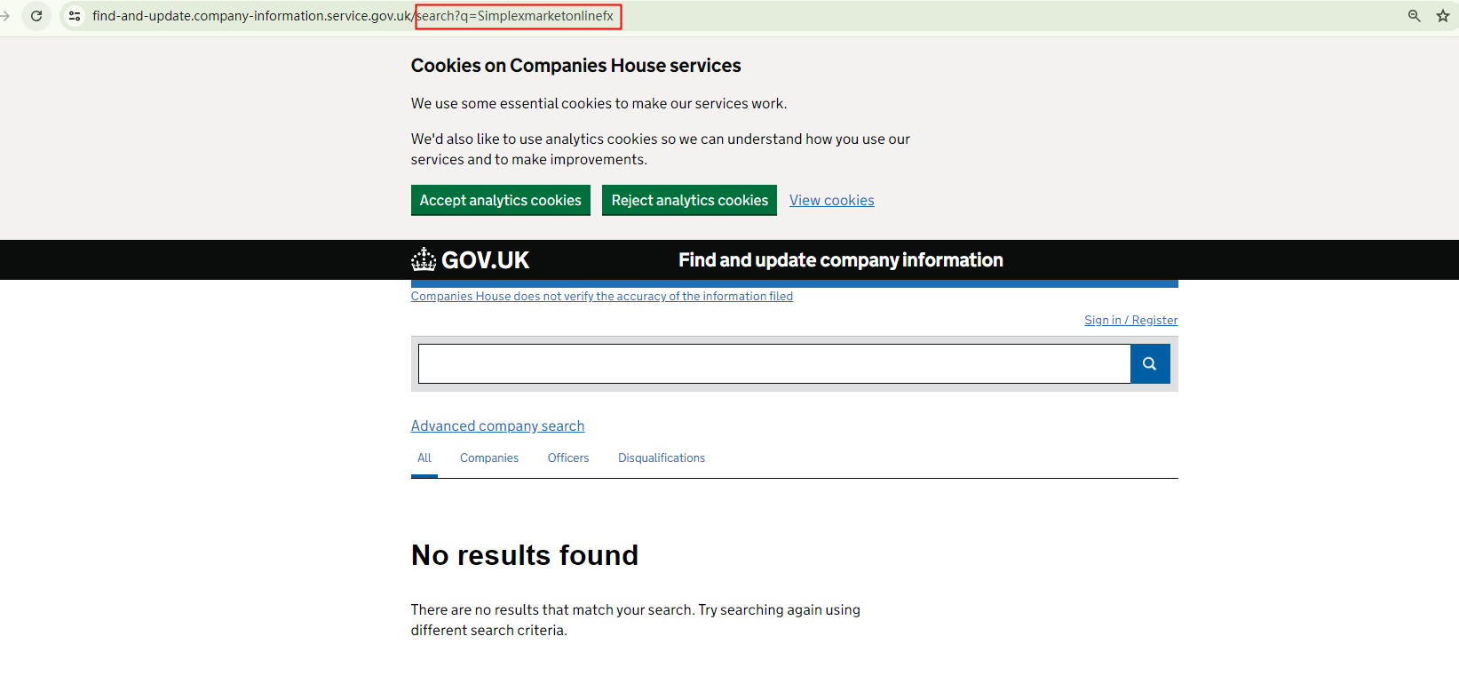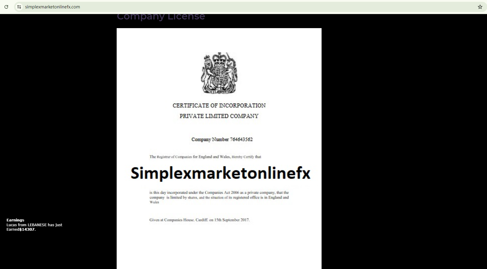 Simplexmarketonlinefx displays a certificate purportedly from Companies House (CH). However, no corresponding records exist in the CH register, indicating that this certificate is fake.