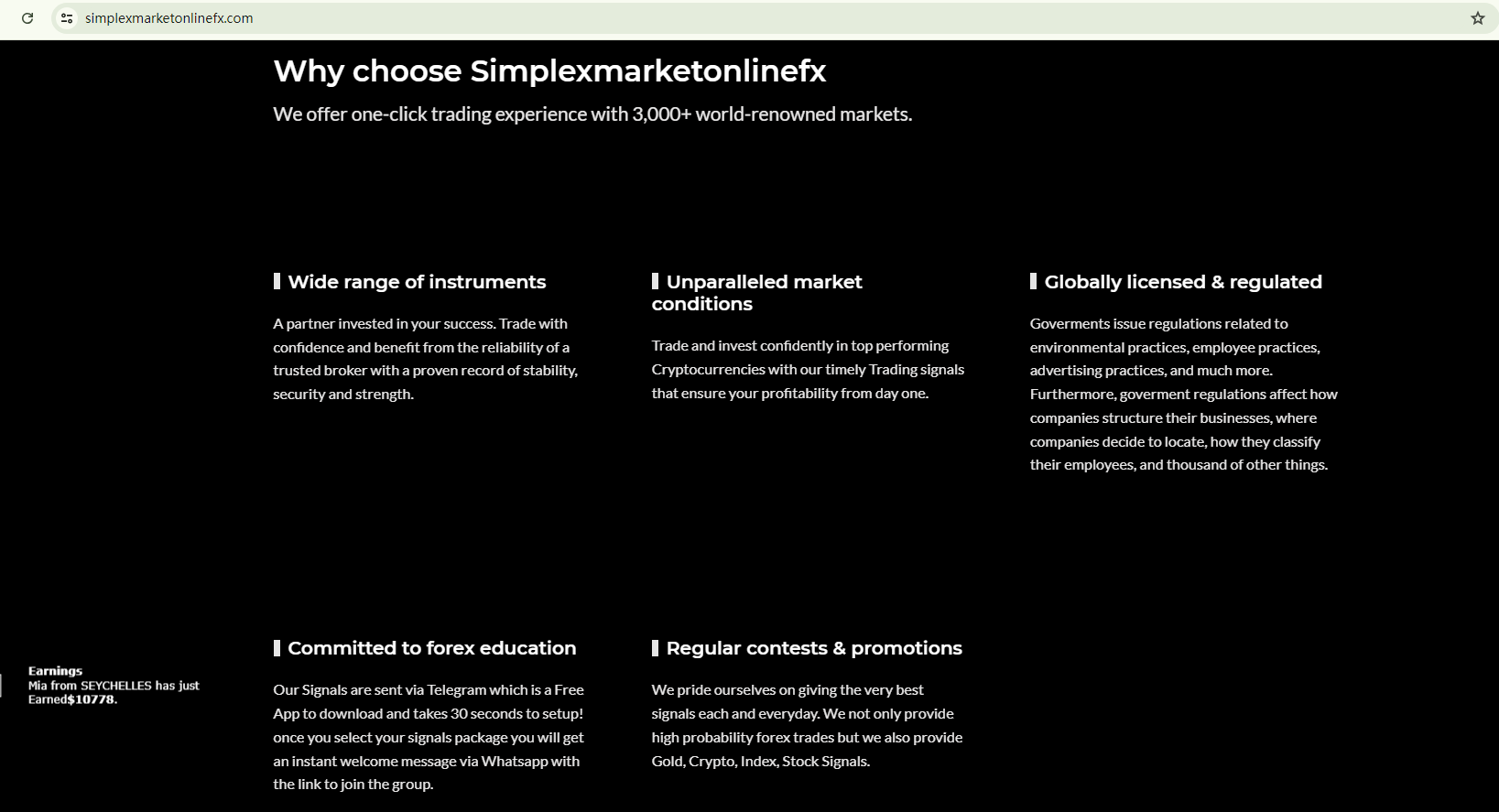 The Simplexmarketonlinefx website mirrors the content and graphics of brokers previously flagged as fraudulent by BrokersView, which is a significant red flag. These sites often begin with phrases like "Let top traders do the job for you…" and promise unrealistically high profits while minimizing the associated risks.