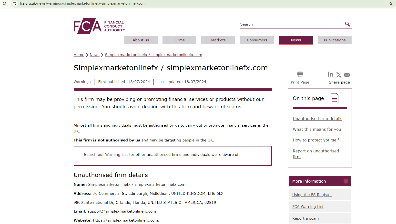 On July 18, 2024, the Financial Conduct Authority (FCA) issued a warning against Simplexmarketonlinefx, believing this company might be providing financial services or products without proper authorization in the UK. https://www.fca.org.uk/news/warnings/simplexmarketonlinefx-simplexmarketonlinefxcom