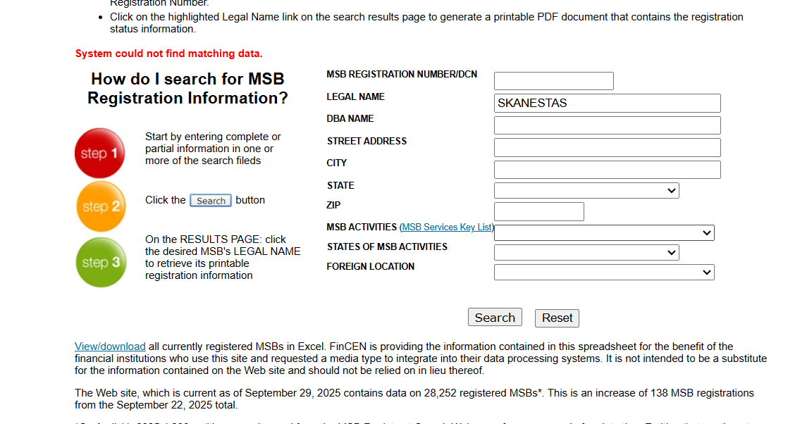 SKANESTAS also claims to be regulated by the NFA and registered with FinCEN as an MSB. However, we searched both organizations’ databases and found no record of SKANESTAS being approved for any financial services. An MSB license is not a brokerage license and does not allow trading activities.