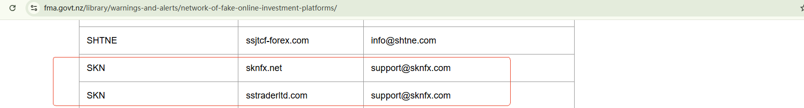 On February 17, 2025, the New Zealand Financial Markets Authority (NZ FMA) released a warning list, advising investors to stay vigilant about 96 suspicious investment websites including SKN (sknfx.net and sstraderltd.com). https://www.fma.govt.nz/library/warnings-and-alerts/network-of-fake-online-investment-platforms/
