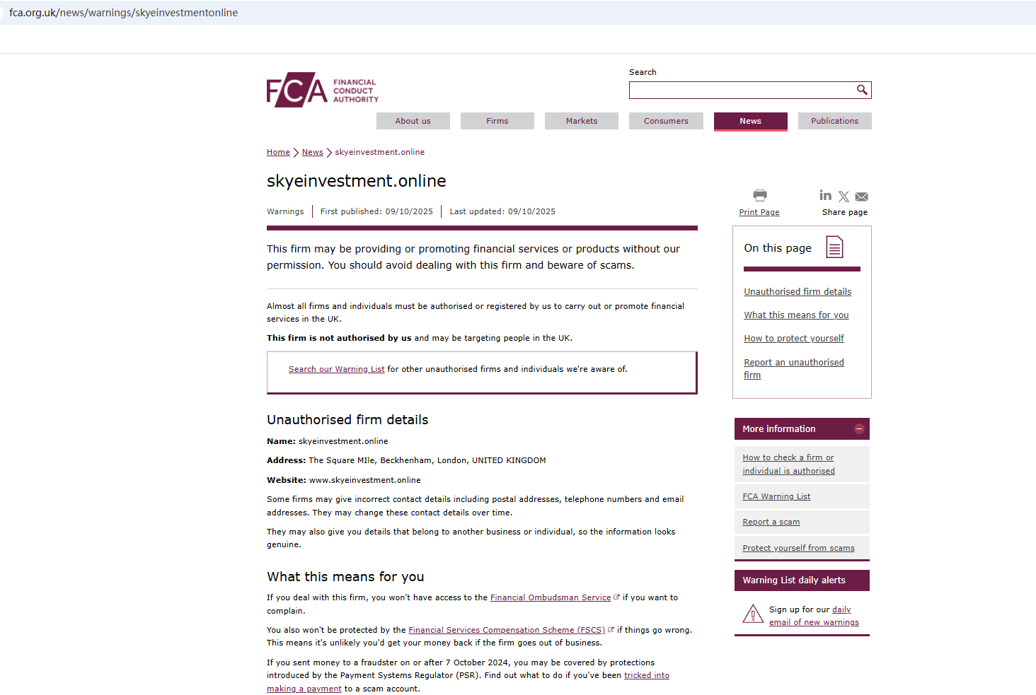 On Oct 7, 2025, the Financial Conduct Authority (FCA) issued a warning regarding Skye Investment, suspecting that this company may be offering financial services or products without the necessary authorization. https://www.fca.org.uk/news/warnings/skyeinvestmentonline