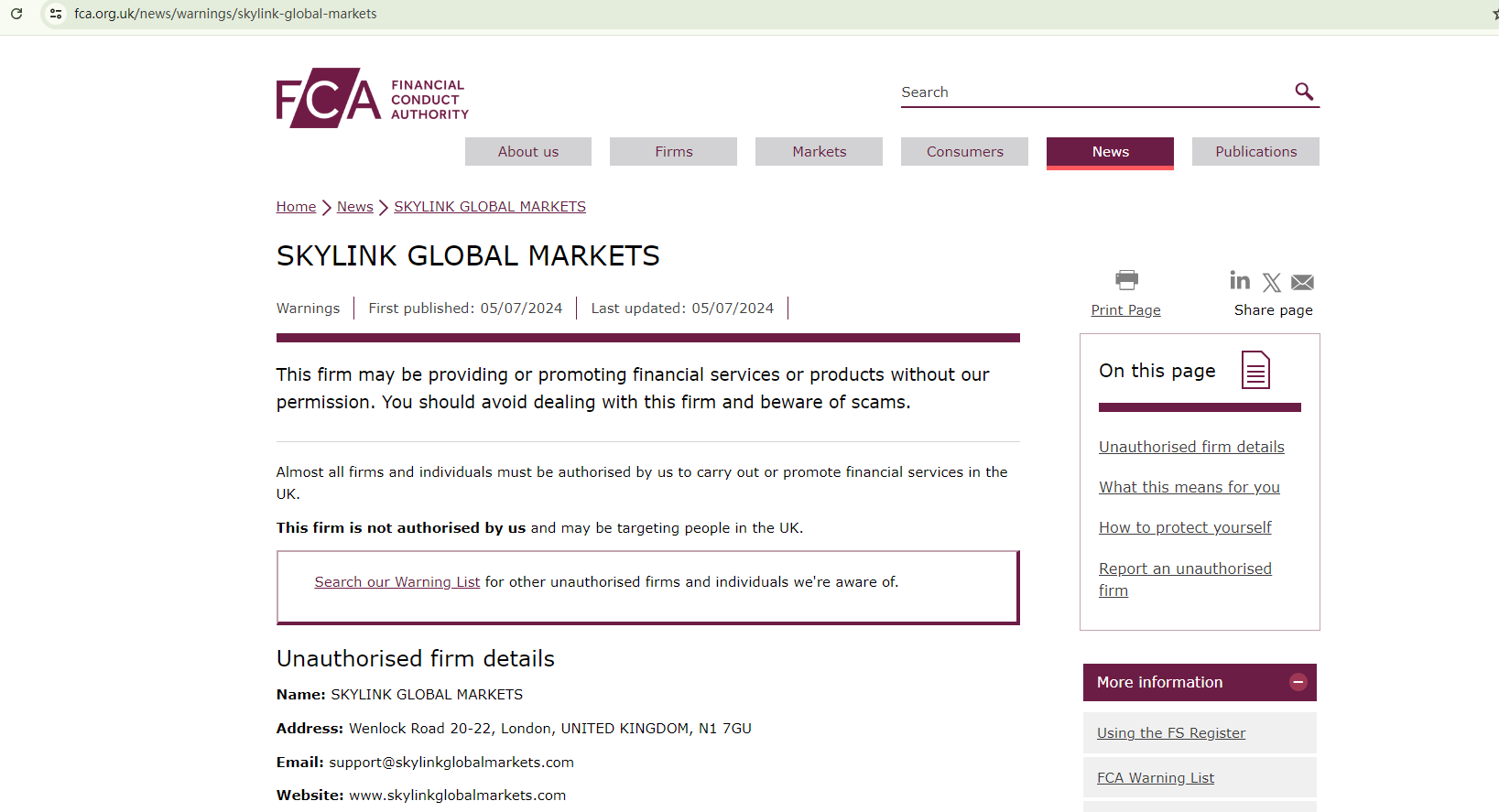 On July 5, 2024, the Financial Conduct Authority (FCA) issued a warning against SKYLINK GLOBAL MARKETS, believing this company might be providing financial services or products without proper authorization in the UK. https://www.fca.org.uk/news/warnings/skylink-global-markets