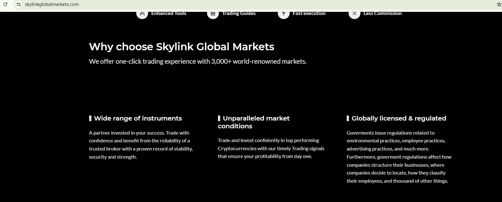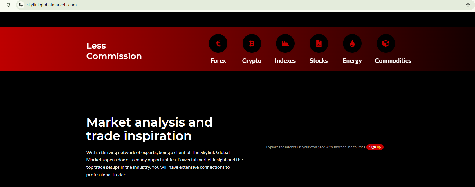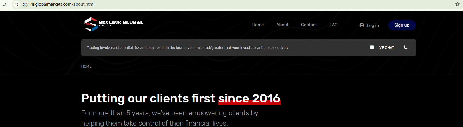 SKYLINK GLOBAL MARKETS was established with a website template commonly associated with fraudulent activities. This template typcially provides prewritten content like product introduction and false regulatory information. While SKYLINK GLOBAL MARKETS claims to be located in the UK, the Financial Conduct Authority (FCA) has issued a warning against SKYLINK GLOBAL MARKETS for the lack of authorization.