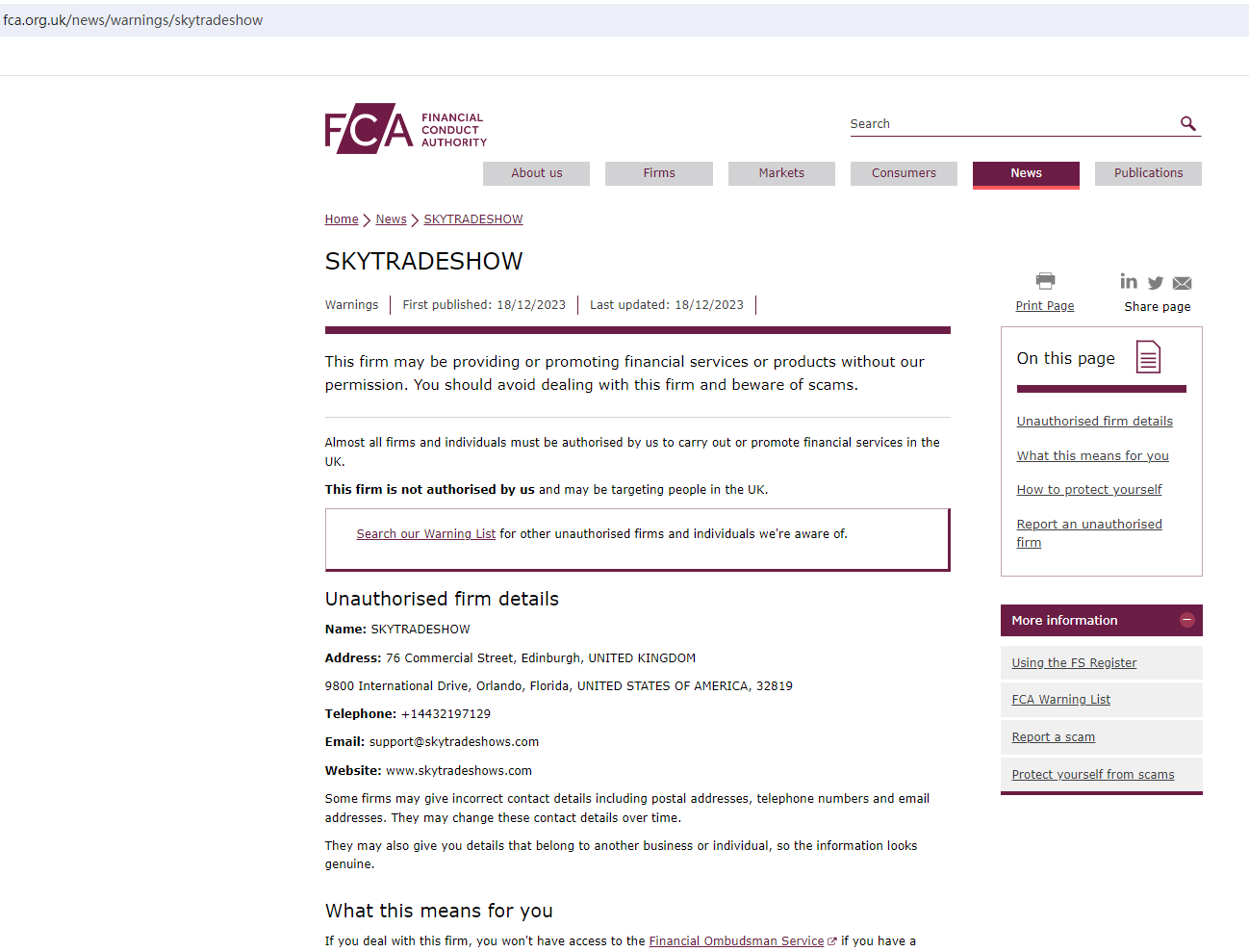 On 18 December 2023, the United Kingdom Financial Conduct Authority (UK FCA) issued a warning that SKYTRADESHOW was providing financial services or products in the UK without authorisation. You may visit: https://www.fca.org.uk/news/warnings/skytradeshow