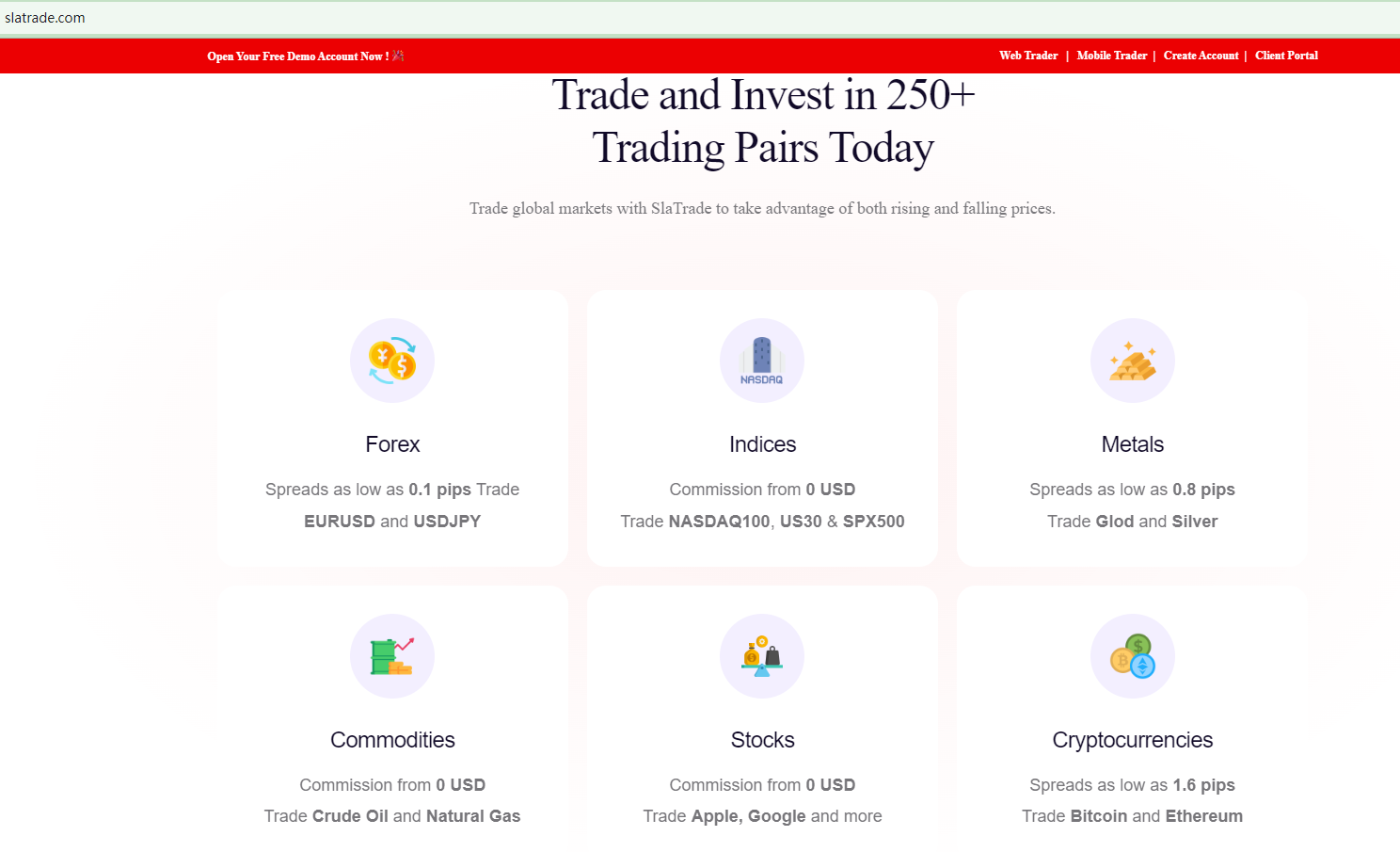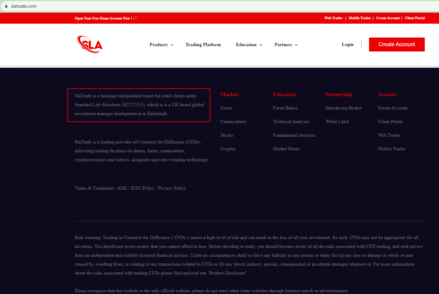 SlaTrade claims to be the trading name of Standard Life Aberdeen, allegedly a UK-based global investment manager.
