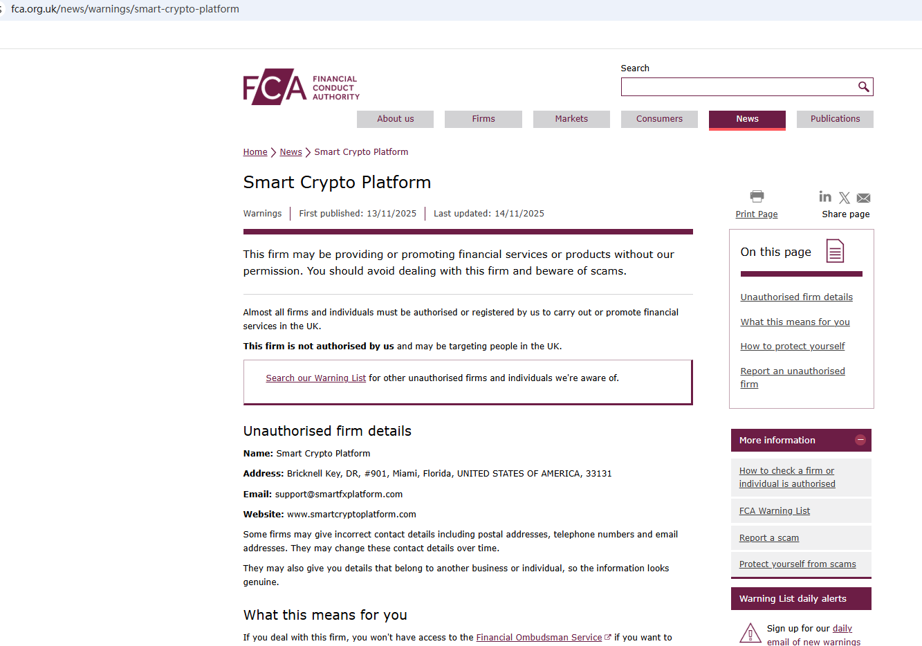 On Nov 14, 2025, the Financial Conduct Authority (FCA) issued a warning regarding Smart Crypto Platform, suspecting that this company may be offering financial services or products without the necessary authorization. https://www.fca.org.uk/news/warnings/smart-crypto-platform