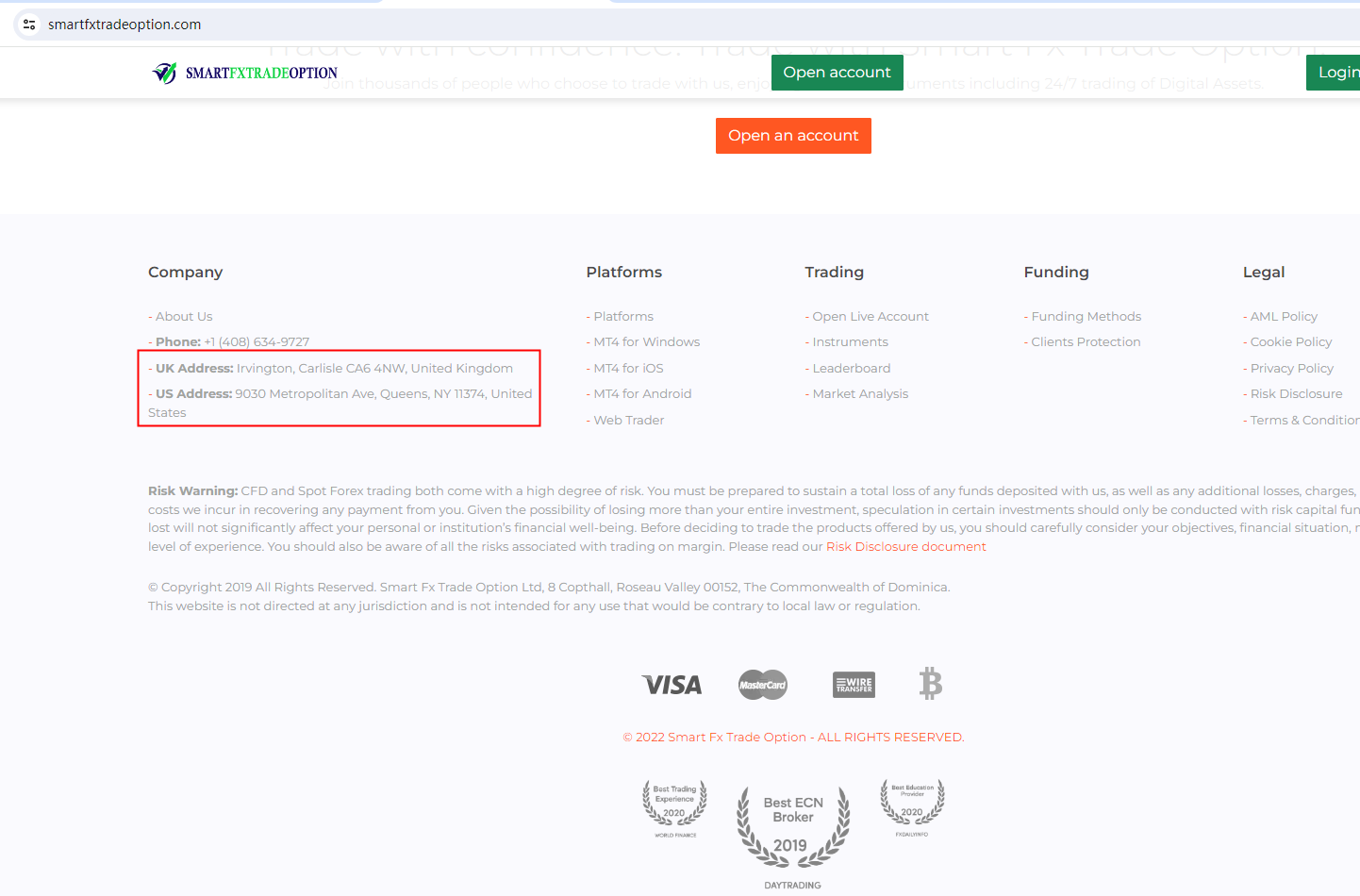 There is no any regulatory information on its website. This broker locates in UK and USA, but we don't find the correct information on U.K Financial Conduct Authority (FCA) and National Futures Association (NFA) matching to Smart Fx Trade Option.