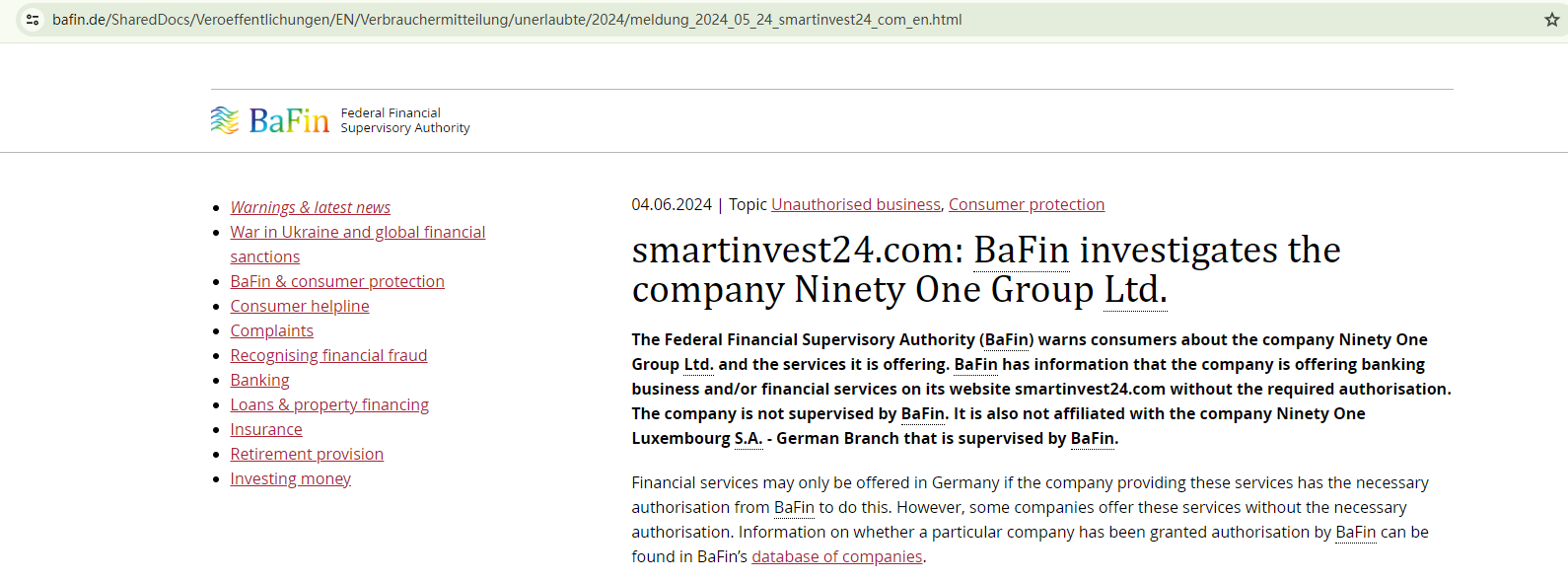 In addition, the Federal Financial Supervisory Authority (BaFin) has issued a warning against Smart Invest 24. According to BaFin, this brand claims to be operated by Ninety One Group Ltd. It is critical to note that the company is not supervised by BaFin and has not affiliated with the company Ninety One Luxembourg S.A. - German Branch that is supervised by BaFin.