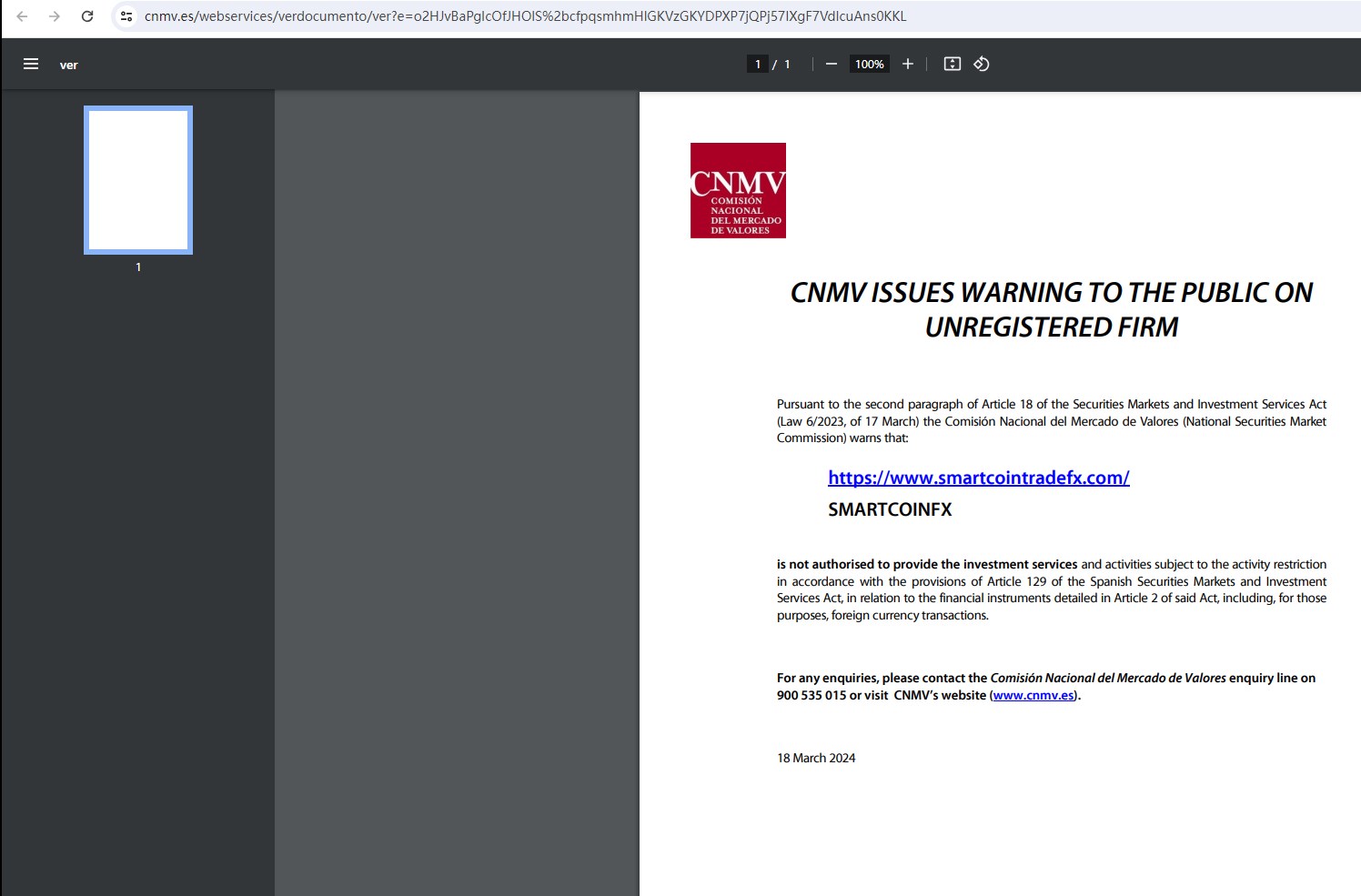 On March 18, 2024, the Comisión Nacional del Mercado de Valores (CNMV) added SMARTCOINFX to its warning list for providing investment services without authorization. You may visit: https://www.cnmv.es/webservices/verdocumento/ver?e=o2HJvBaPgIcOfJHOlS%2bcfpqsmhmHlGKVzGKYDPXP7jQPj57IXgF7VdIcuAns0KKL.