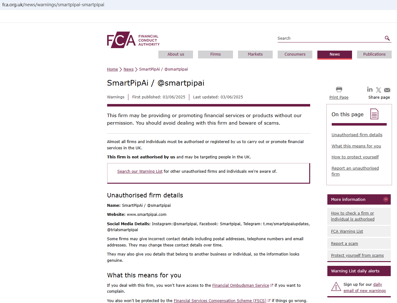 On Jun 3, 2025, the Financial Conduct Authority (FCA) issued a warning against SmartPipAi, believing this company might be providing financial services or products without proper authorization in the UK. https://www.fca.org.uk/news/warnings/smartpipai-smartpipai