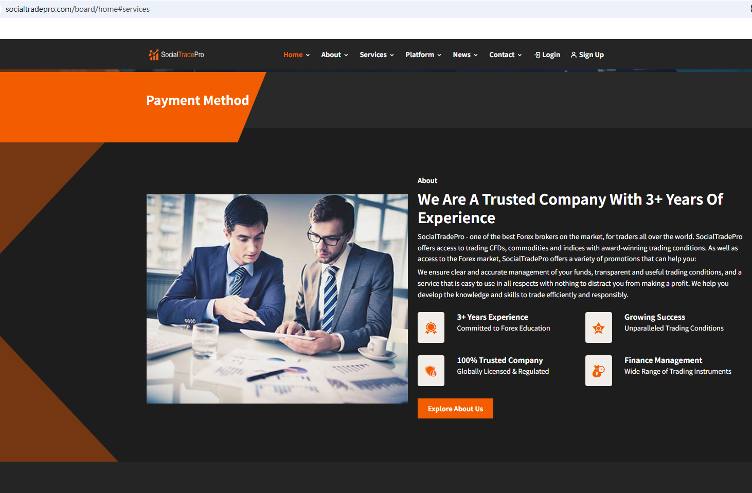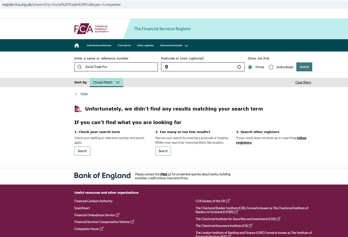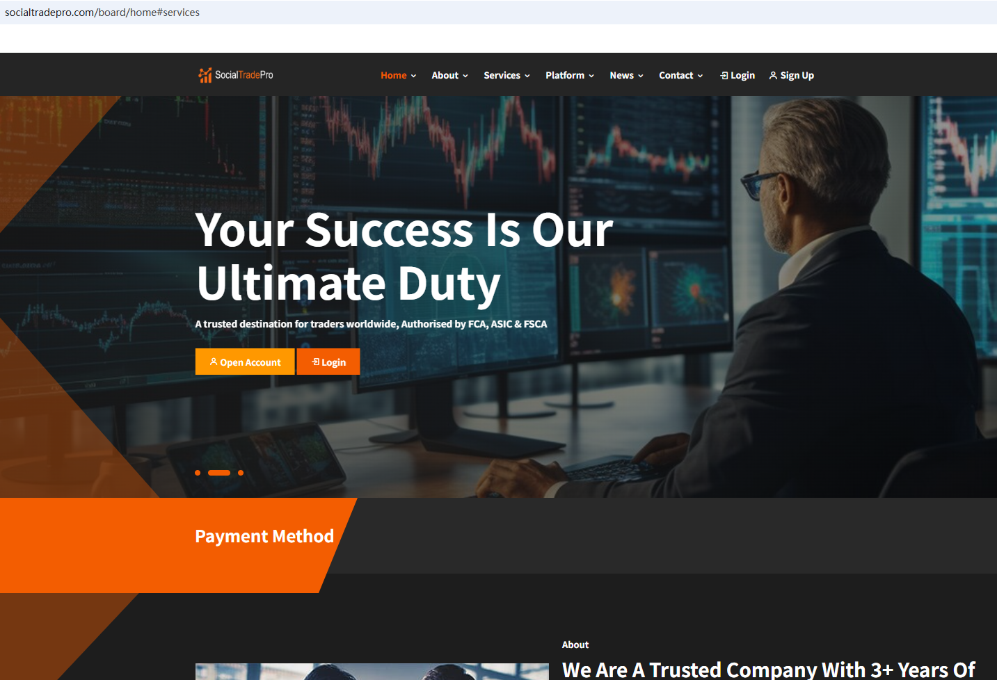 According to its website, it is to be regulated by the Financial Conduct Authority (FCA), the Financial Sector Conduct Authority (FSCA), and the Australian Securities and Investments Commission (ASIC). Upon investigation, no matching information was found in the FCA and FSCA. In addition, we found that the Australian Securities & Investments Commission (ASIC) issued a warning against Social Trade Pro, believing this company might be providing financial services or products without proper authorization.