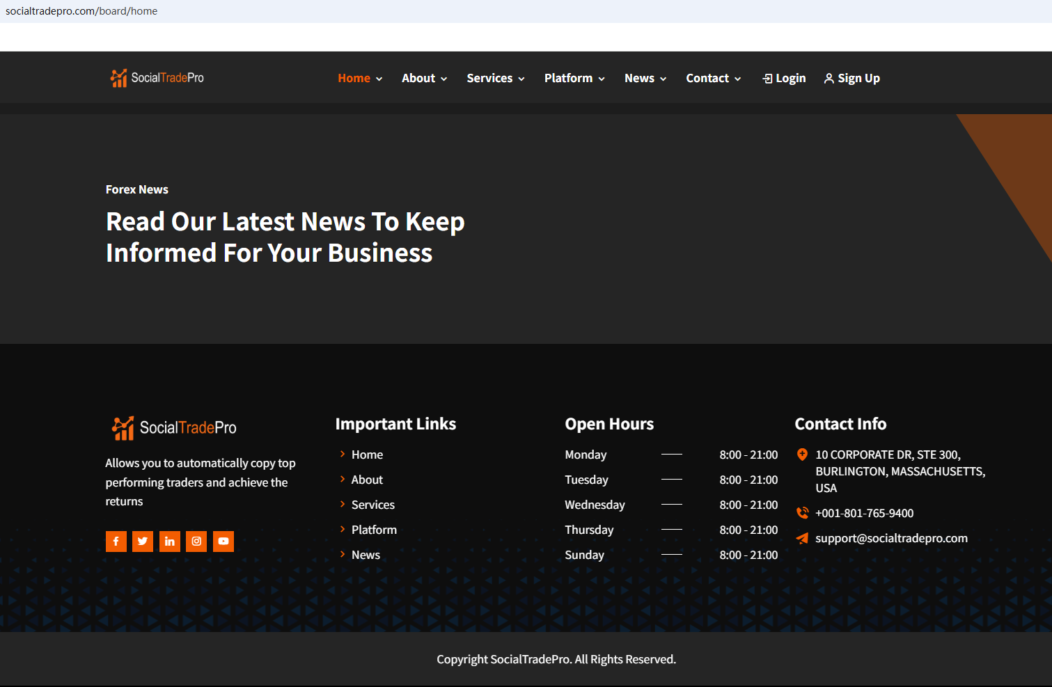 In essence, Social Trade Pro is not regulated by any governing body. Entrusting it with investors' funds is highly risky, as there are no legal protections in place to safeguard the funds. Social Trade Pro appears to be a scam.
