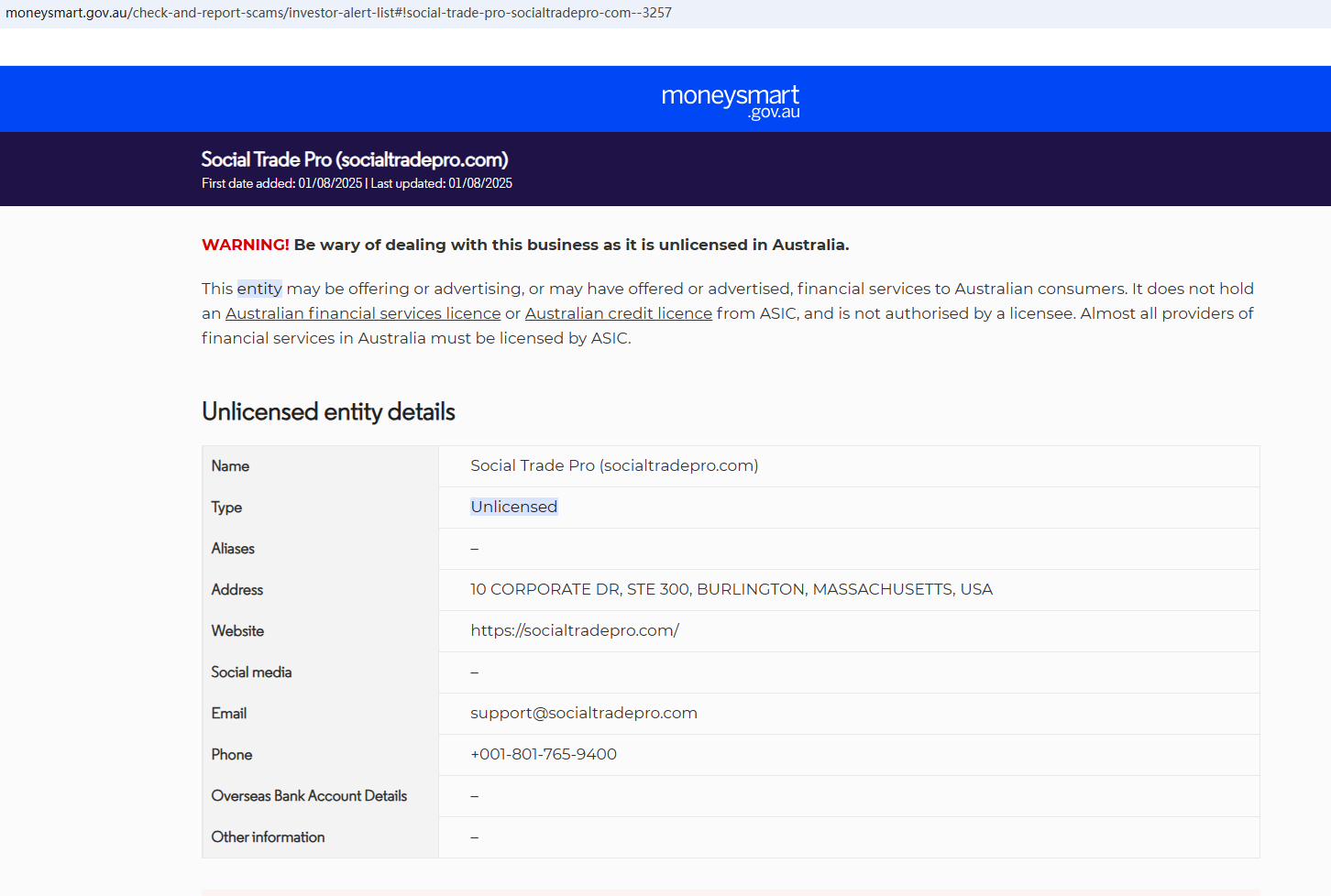 On Aug 1, 2025, the Australian Securities & Investments Commission (ASIC) issued a warning against Social Trade Pro, believing this company might be providing financial services or products without proper authorization. https://moneysmart.gov.au/check-and-report-scams/investor-alert-list#!social-trade-pro-socialtradepro-com--3257