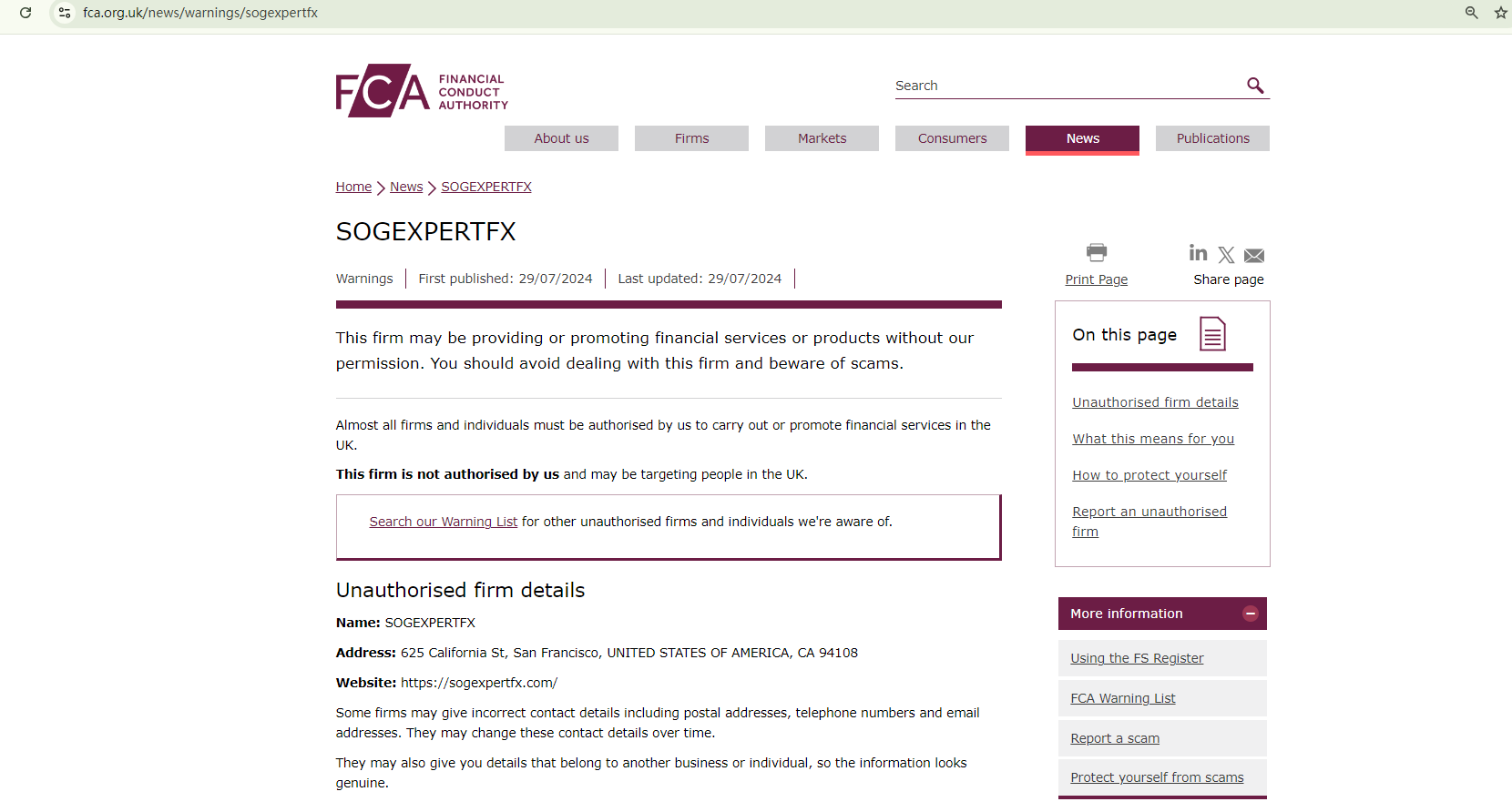 Thirdly, the Financial Conduct Authority (FCA) has flagged SOGEXPERTFX as an unauthorized firm in the UK. This is a significant warning sign.