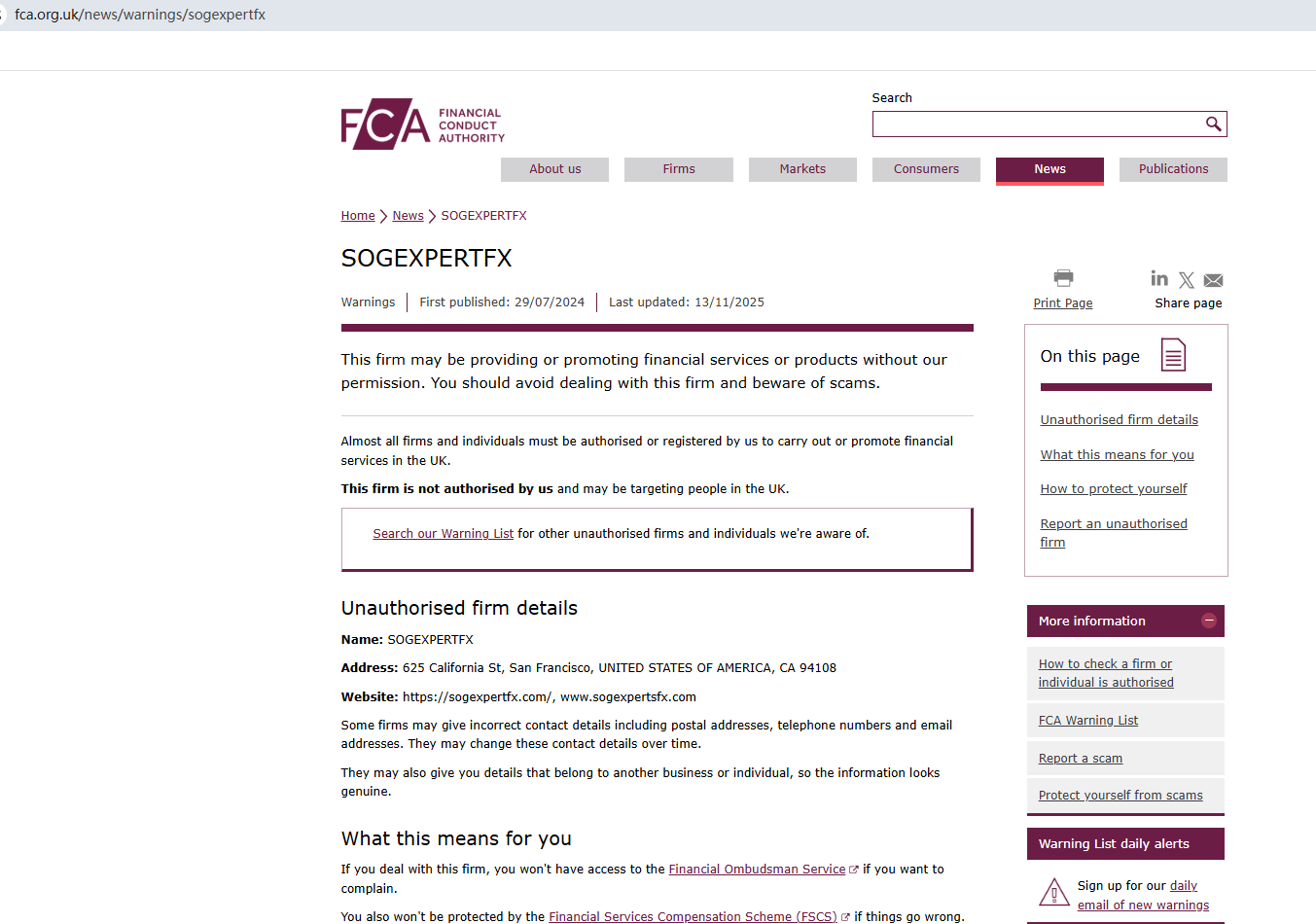 On Nov 13, 2025, the Financial Conduct Authority (FCA) issued a warning regarding SOGEXPERTFX, suspecting that this company may be offering financial services or products without the necessary authorization. https://www.fca.org.uk/news/warnings/sogexpertfx