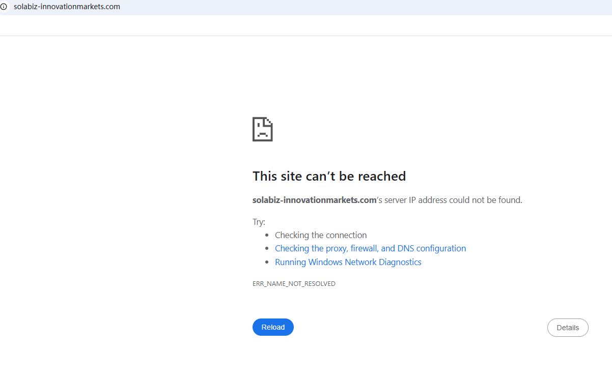 BrokersView found that the domain "https://solabiz-innovationmarkets.com/" is currently inaccessible. This is widely regarded as a significant red flag, as the suspension of a broker's website often points to underlying regulatory or operational issues.