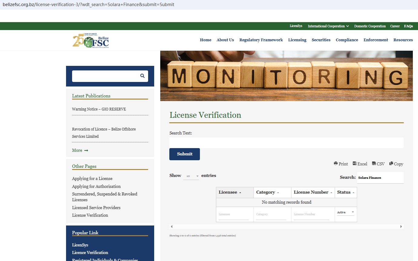 According to its website, it claims to be regulated by multiple regulatory bodies. Upon investigation, no matching information was found in the Australian Securities & Investment Commission (ASIC), Dubai Financial Services Authority (DFSA), Financial Sector Conduct Authority (FSCA), Cyprus Securities and Exchange Commission (CySEC), and International Financial Services Commission of Belize (Belize IFSC). In addition, the Financial Authority (Autorité des Marchés Financiers, AMF) added Solara Finance Limited to the warning list for being an unauthorized company engaging in forex activities.
