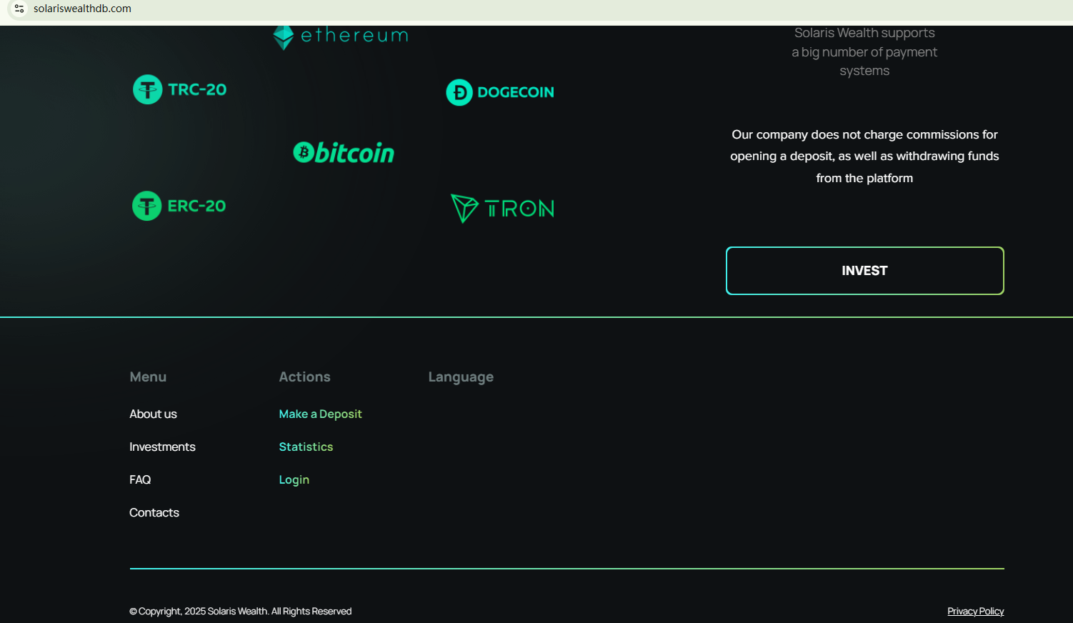 In essence, Solaris Wealth is not regulated by any governing body. Entrusting it with investors' funds is highly risky, as there are no legal protections in place to safeguard the funds. Solaris Wealth appears to be a scam.