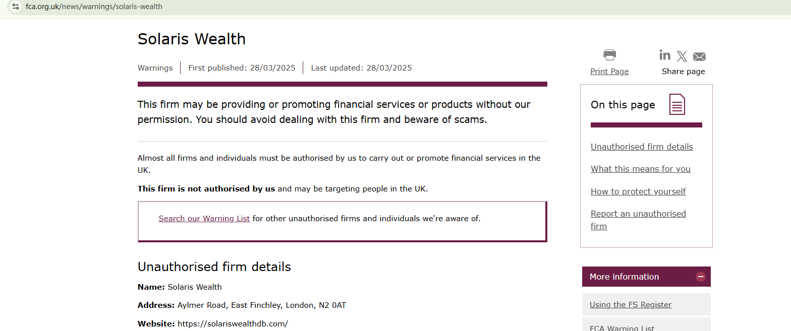 On March 28, 2025, the Financial Conduct Authority (FCA) issued a warning against Solaris Wealth, believing this company might be providing financial services or products without proper authorization in the UK. https://www.fca.org.uk/news/warnings/solaris-wealth