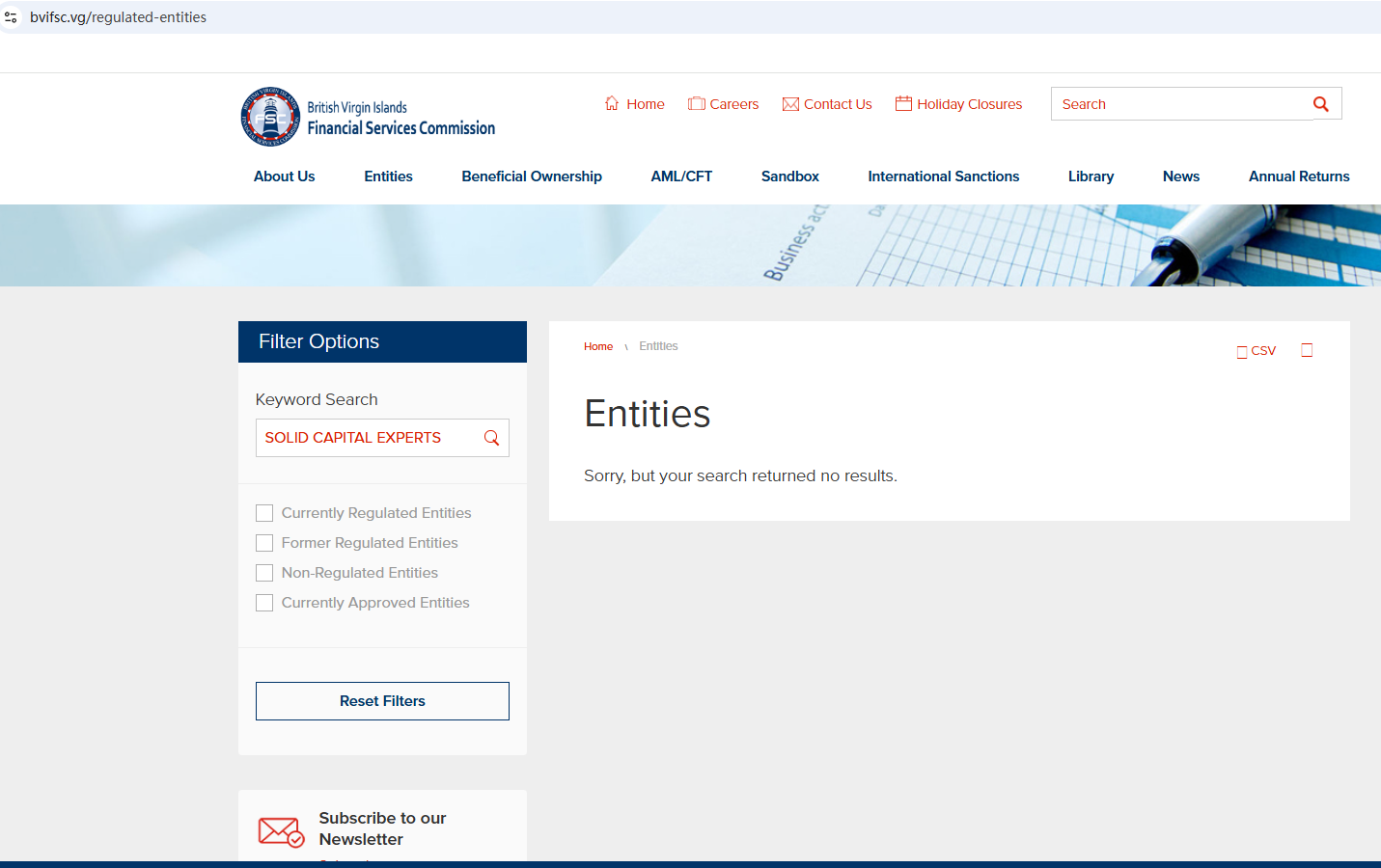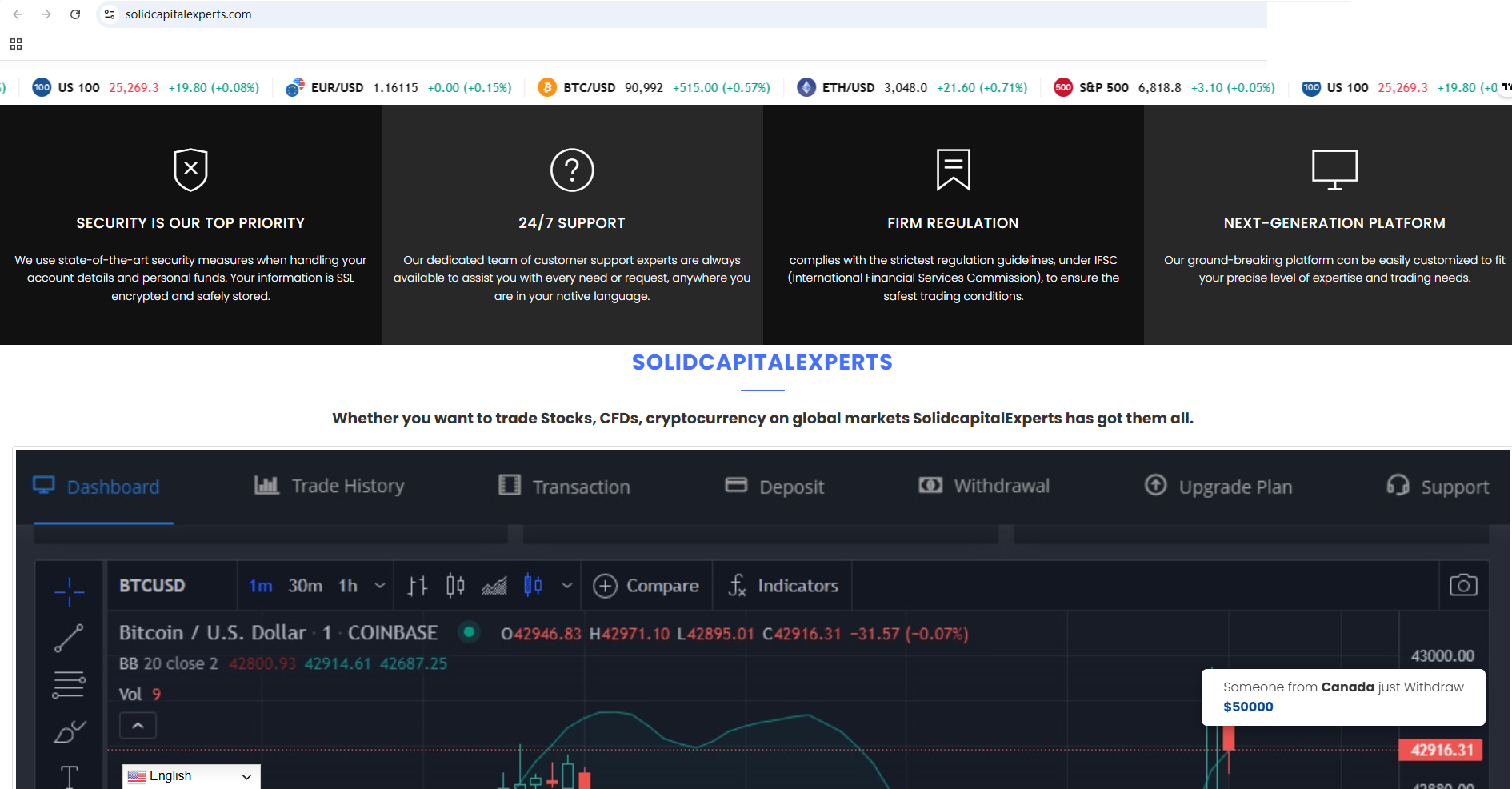 According to its website, it is regulated by the British Virgin Islands Financial Services Commission (BVI FSC), but a search of the BVI FSC found no matching information. It also mentions registration with the U.S. Securities and Exchange Commission (US SEC) at the bottom of its website; however, it is well known that the SEC does not have the authority to regulate foreign exchange. In addition, the Financial Conduct Authority (FCA) issued a warning regarding SOLID CAPITAL EXPERTS, suspecting that this company may be offering financial services or products without the necessary authorization.
